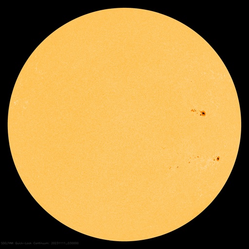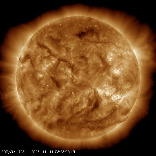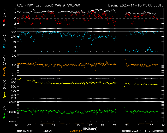 2023/11/11 13:01 更新 高速の太陽風が続いています。CMEによる太陽風の乱れが近づいています。 担当 篠原 太陽風は、速度が670km/秒から550km/秒へ下がっていますが、 高速の状態が続いています。 11月5日に始まった速度の高まりは、 7日目に入ろうとしています。 太陽風の磁場強度は、2〜3nTと弱くなっています。 高速太陽風の領域は終わりに近づいている様です。 SDO衛星AIA193では、コロナホールは西の端に達して、 既に見えなくなっています。 磁場の南北成分は、小幅で南北に変化しています。 速度は高まっていますが、影響は限定的で、 AE指数は小規模の変化が見られる程度です。 この後は、昨日紹介したCME(コロナ質量放出)による 太陽風の乱れに注目してください。 NOAA/SWPCの予報では明日の早朝となっていますが、 どうなるでしょうか。 太陽は、南西(右下)の3477黒点群で、 C3.2、C3.4の小規模フレアが発生しています。 可視光写真を見ると、黒点は西側(右側)ばかりに見えて、 東側(左側)にはありません。 3477群などが西に沈んでいくと、 太陽はとても穏やかになるかもしれません。 ![]() SDO衛星のAIA193カメラによる太陽コロナの様子 (c) SDO (NASA) ![]() SDO衛星による太陽の可視光写真。マウスの矢印を写真に重ねると、黒点番号付きの写真に切り替わります。 (c) SDO (NASA) ![]() ACEが観測した太陽風の磁場(1番上の枠、白線は全体の強度、赤線は南北成分) および、太陽風の密度(3番目の橙線)、速度(4番目の黄線) (c) NOAA/SWPC ![]() AE指数(速報値) 下段のAEグラフの値が高くなると、オーロラ活動が活発化しています。 (c) 京都大学WDC ![]() ![]() 27日の太陽周期に合わせた図 太陽が同じ面を地球に向けていた27日前の変化から、今後を予想することができます。 (c) 作図:宇宙天気ニュース