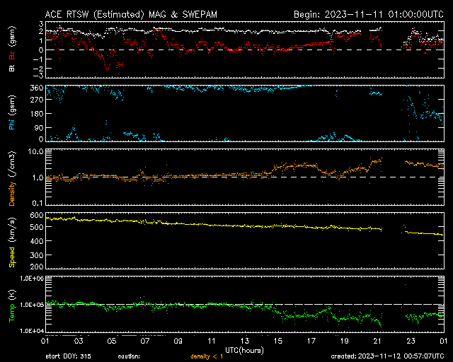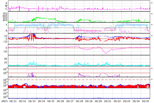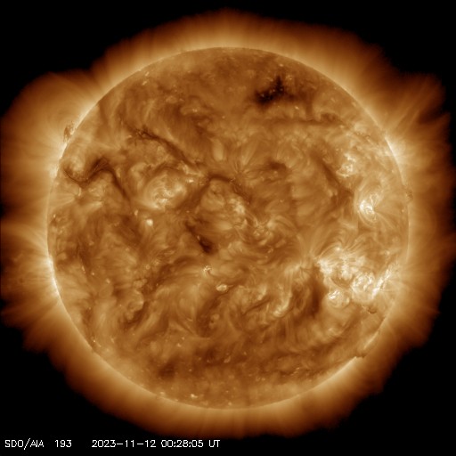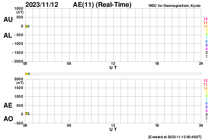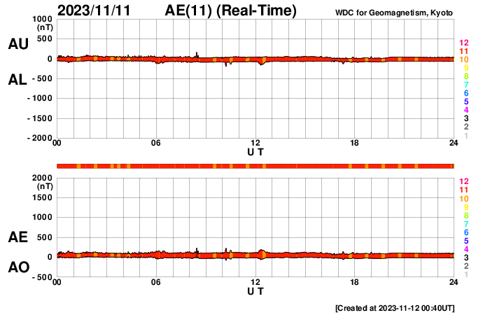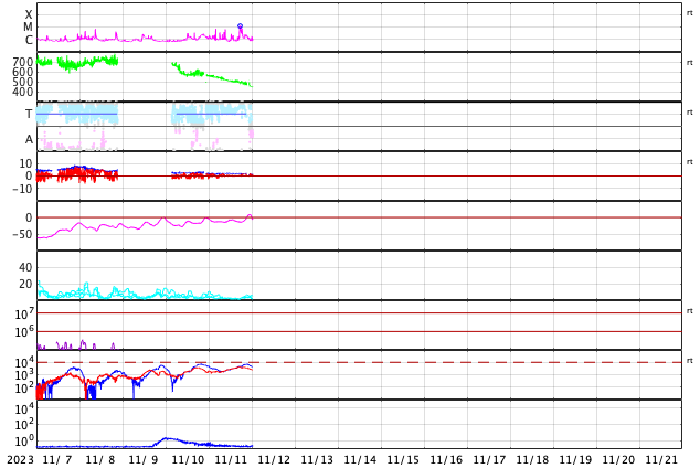 2023/11/12 09:58 更新 太陽風は平均的な速度に戻っています。乱れはまだ到来していません。 担当 篠原 太陽風の速度は、 550km/秒から450km/秒へゆっくりと低下しています。 高速の状態は終わって、平均的な速度に戻っています。 磁場強度は、2nTと弱い状態でしたが、 グラフの最後は1nTとさらに弱くなっています。 9日夜に発生したCME(コロナ質量放出)による太陽風の変化は、 まだ来ていない様です。 この後到来すると思われるので、引き続き注目してください。 磁気圏は静穏な状態です。 AE指数はほとんど変化がありません。 SDO衛星AIA193の太陽コロナ写真は、 全体がぼんやりと光っていて、 コロナホールは特に見えていません。 CMEによる乱れを除くと、 太陽風はしばらく穏やかに推移しそうです。 太陽では、北西側(右上)の3483黒点群と、 南西の端近く(右下)の3477黒点群の活動が強まり、 3483群で、C7.1、C6.5などの小規模フレアが、 3477群で、M1.2の中規模フレア、C7.9の小規模フレア などが発生しています。 どちらも西の端に近付いていますが、 この後も活動は続くでしょうか。