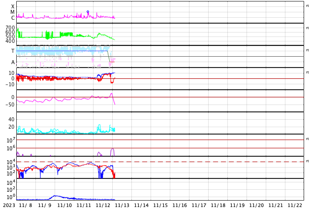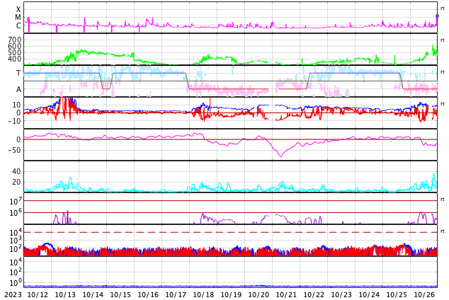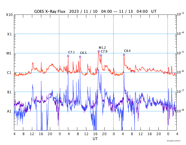 GOES衛星の太陽X線強度。赤・橙 = 0.1〜0.8 nm、青・紫 = 0.05〜0.4 nm (c) データ:NOAA/SWPC、作図:宇宙天気ニュース ![]() | ||||||||||||||||||||||||||||||||||||||||||||||||||||||||||||||||||||||||||||||||||||||||||||||||||||||||||||||||||||||||||||||||||||||||||||||||||||||||||||||||||||||||||||||||||||||||||||||||||||||||||||||||||||||||||||||||||||||||||||||||||||||||||||||||||||||||||