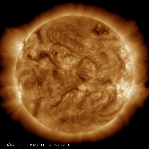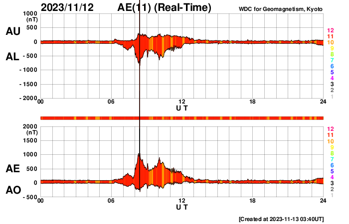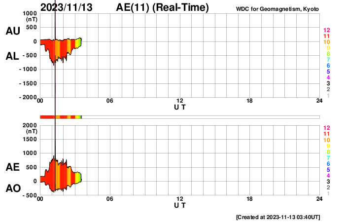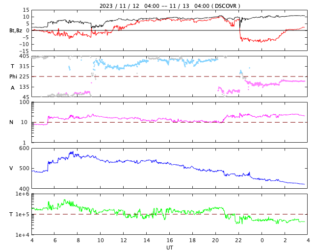 2023/11/13 13:00 更新 太陽風の乱れが到来しました。磁気圏の活動は一時的な強まりになっています。 担当 篠原 太陽風の乱れは、昨日の午後、 12日14時半(世界時12日5時半)にDSCOVR衛星で観測されました。 速度は、460km/秒から520km/秒へ、 磁場強度は、2nTから5nTと、比較的小幅の変化でした。 速度は、その後、570km/秒まで高まり、以降は次第に低下して、 現在は420km/秒と平均的な状態に戻っています。 磁場強度は、反対に次第に強まっていて、 現在は11nTに達しています。 磁場の南北成分は、 乱れの最初に、-5nTと南向きが4時間ほど続き、 一旦、北向きに切り替わって強まり、 今朝、13日7時(世界時12日22時)に急に南向きに切り替わって、 -8nTの状態が3時間ほど続き、 現在は再び北向きになっています。 磁気圏の活動は、磁場が南を向いた頃に一時的に強まる程度で、 AE指数は、最初の南向きで、500nT〜1000nTの中規模の変化が見られ、 2回目の南向きでは、800nTの変化が発生しています。 現在の磁場は北向きになっているので、 この傾向が続くと、磁気圏は穏やかになるでしょう。 SDO衛星AIA193では、コロナホールは特に見えていません、 今回の乱れが終わると、 太陽風は穏やかな状態がしばらく続きそうです。 太陽は、12日13時半(世界時12日4時半)に、 南西(右下)の3484黒点群で、 C8.4と大きめの小規模フレアが発生しました。 その後は、C1〜2の小さいフレアが発生した程度で、 太陽は穏やかな状態です。