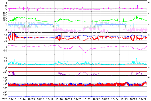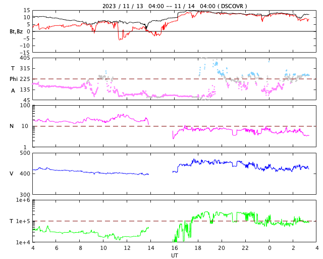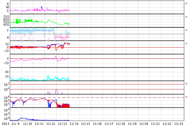 - 2023/11/13 13:00 太陽風の乱れが到来しました。磁気圏の活動は一時的な強まりになっています。