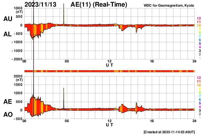 下段のAEグラフの値が高くなると、オーロラ活動が活発化しています。
