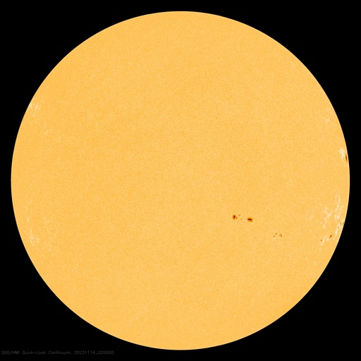 SDO衛星による太陽の可視光写真。マウスの矢印を写真に重ねると、黒点番号付きの写真に切り替わります。