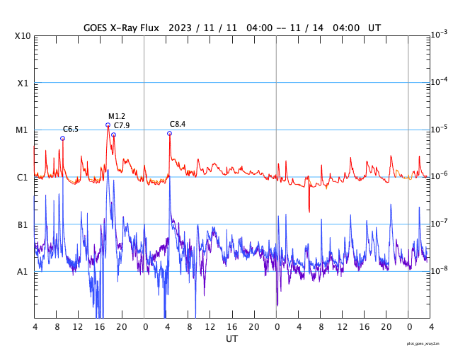 GOES衛星の太陽X線強度。赤・橙 = 0.1〜0.8 nm、青・紫 = 0.05〜0.4 nm