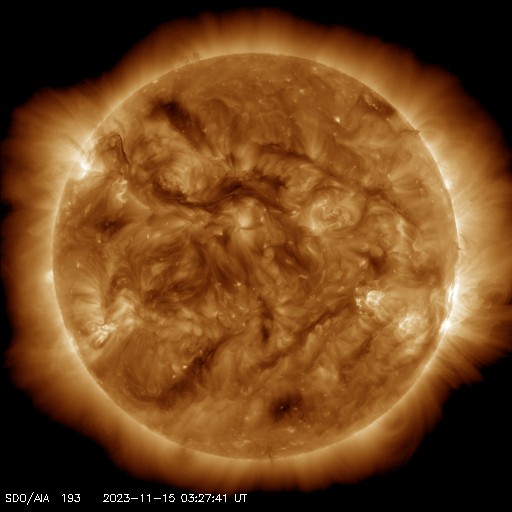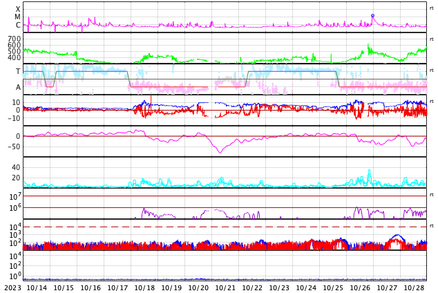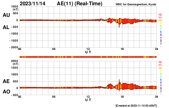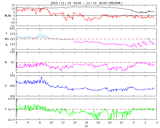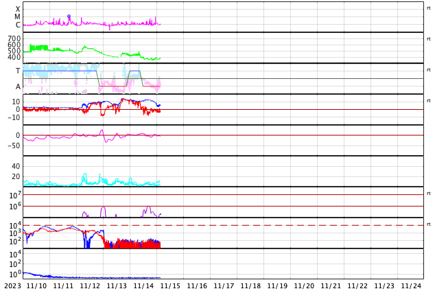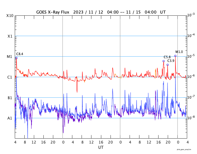 2023/11/15 12:50 更新 M1.0の中規模フレアが発生しました。太陽風は低速になっています。 担当 篠原 昨日のニュースの後も 太陽の南西の端近く(右下)での活動は続き、 C1〜2の小さい小規模フレアが多く発生しました。 今日に入ったころからフレアの規模がやや大きくなり、 北西側(右上)の3483群でC5.8、 南西側の3484群でC3.9の小規模フレアが起きた後、 今朝、15日8時(世界時14日23時)に、 南西の3485群でM1.0の中規模フレアが発生しました。 これらの領域は、この後、太陽の向こう側に進みます。 太陽は穏やかになりそうです。 太陽風は、速度が430km/秒から360km/秒に下がり、 低速になっています。 10nTを超えるくらいに強まっていた磁場強度は、 グラフの最後で5nTに下がり、平均的な状態に戻っています。 磁場の南北成分は、 グラフの中盤で南向きにしばらく振れた後、 後半は0nT付近か弱い南寄りです。 AE指数は、グラフの途中で小規模の変化が発生して、 その後は変化が小さくなっています。 現在の太陽風の様子から、 この後の磁気圏は、穏やかになりそうです。 ![]() SDO衛星のAIA193カメラによる太陽コロナの様子 (c) SDO (NASA) ![]() SDO衛星による太陽の可視光写真。マウスの矢印を写真に重ねると、黒点番号付きの写真に切り替わります。 (c) SDO (NASA) ![]() GOES衛星の太陽X線強度。赤・橙 = 0.1〜0.8 nm、青・紫 = 0.05〜0.4 nm (c) データ:NOAA/SWPC、作図:宇宙天気ニュース ![]() DSCOVRが観測した太陽風の磁場(黒線は全体の強度、赤線は南北成分) 磁場の向き、プラズマの密度、速度、温度 (c) データ:NOAA/SWPC、作図:宇宙天気ニュース ![]() AE指数(速報値) 下段のAEグラフの値が高くなると、オーロラ活動が活発化しています。 (c) 京都大学WDC ![]() ![]() 27日の太陽周期に合わせた図 太陽が同じ面を地球に向けていた27日前の変化から、今後を予想することができます。 (c) 作図:宇宙天気ニュース