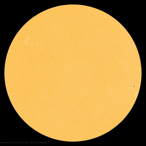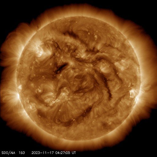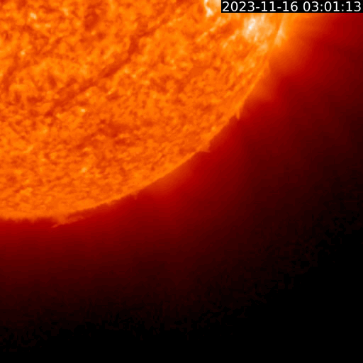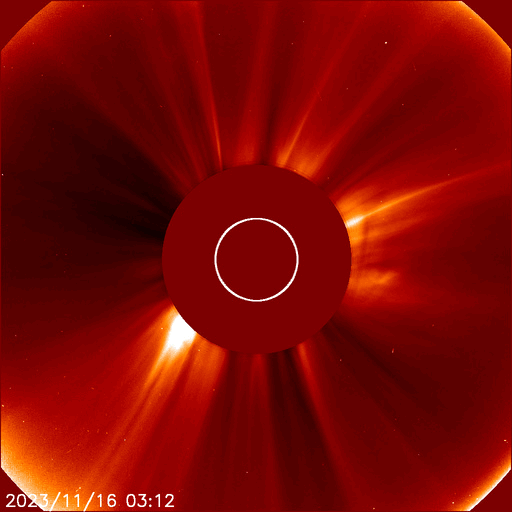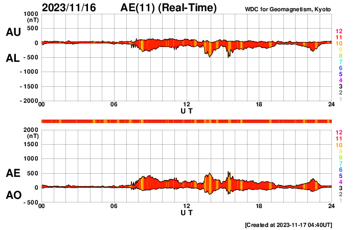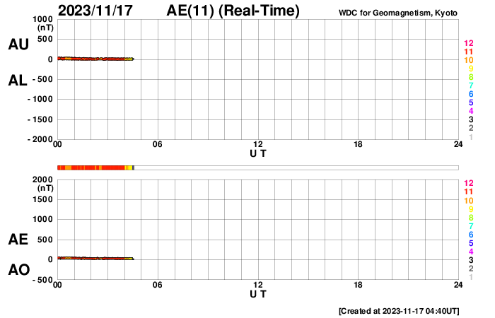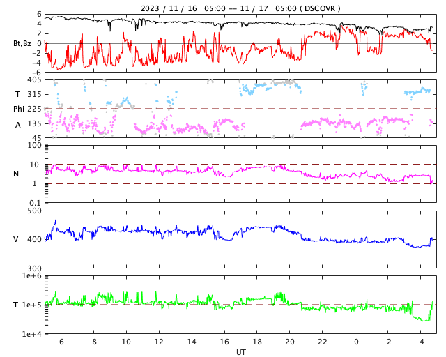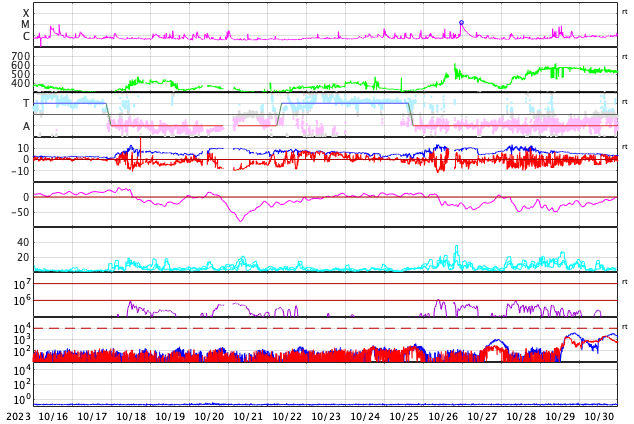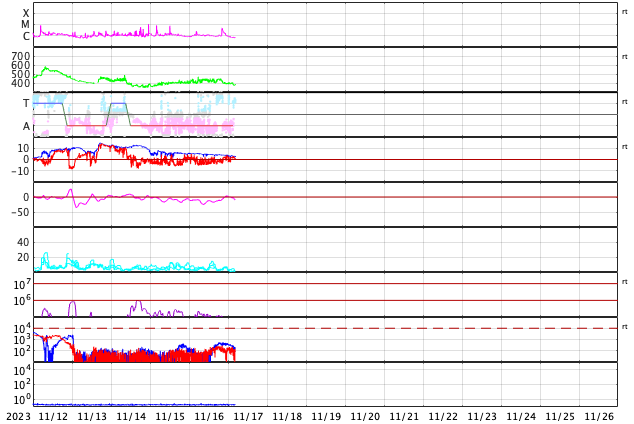 2023/11/17 14:00 更新 太陽風はやや低速になり、磁気圏は穏やかです。 担当 篠原 太陽風の速度は、420km/秒からゆっくり下がって、 最後は380km/秒とやや低速になっています。 磁場強度も、5nTから3nTへ下がり、やや弱い状態です。 太陽風は穏やかです。 磁場の南北成分は、 昨日のニュースの後に南寄りに傾向が変わっています。 そして、今朝以降は北寄りになっています。 磁気圏の活動もこの変化により、 AE指数は、グラフの中盤は小規模の変化が続いていましたが、 最後は変化がなくなって穏やかになっています。 SDO衛星AIA193は、 小さいコロナホールが見えている程度です。 太陽風は、穏やかな状態がしばらく続きそうです。 太陽は、今朝、17日5時(世界時16日20時)に、 南東の端(左下)でC4.8の小規模フレアが発生しました。 可視光写真では黒点が現れています。 この後も活動が続くでしょうか。 また、16日13時(世界時16日4時)に、 南西の端(右下)でプロミネンス噴出が発生しています。 太陽の向こう側の現象です。 GOES衛星SUVI 304の動画を掲載します。 きれいなループを描いてガスが広がっています。 SOHO衛星LASCO C2、C3では、 CME(コロナ質量放出)が観測されています。 向こう側の現象なので、影響はありません。