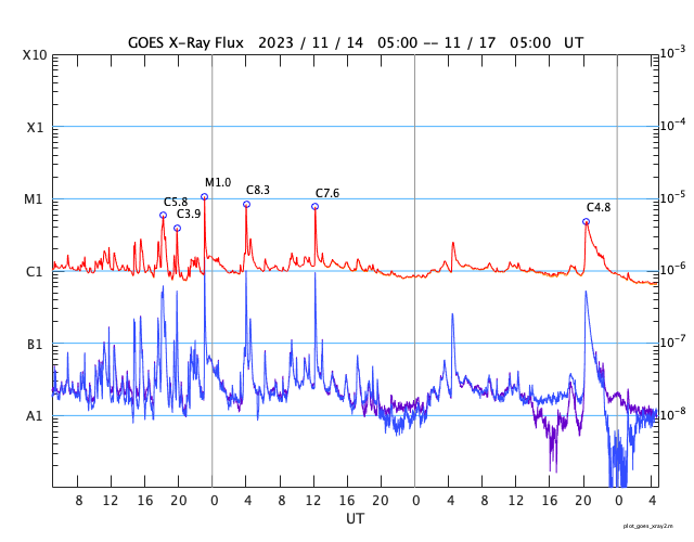 GOES衛星の太陽X線強度。赤・橙 = 0.1〜0.8 nm、青・紫 = 0.05〜0.4 nm (c) データ:NOAA/SWPC、作図:宇宙天気ニュース ![]() | |||||||||||||||||||||||||||||||||||||||||||||||||||||||||||||||||||||||||||||||||||||||||||||||||||||||||||||||||||||||||||||||||||||||||||||||||||||||||||||||||||||||||||||||||||||||||||||||||||||||||||||||||||||||||||||||||||||||||