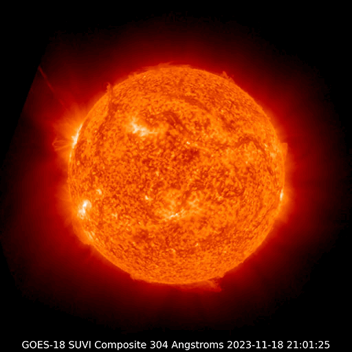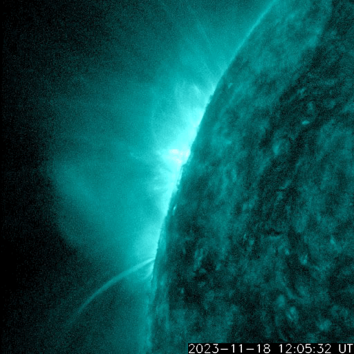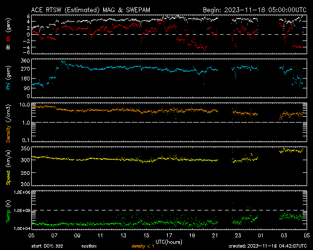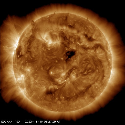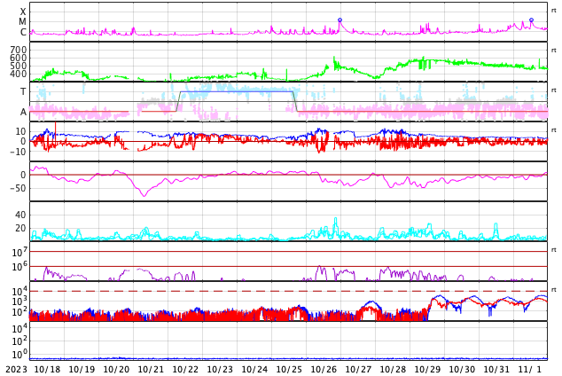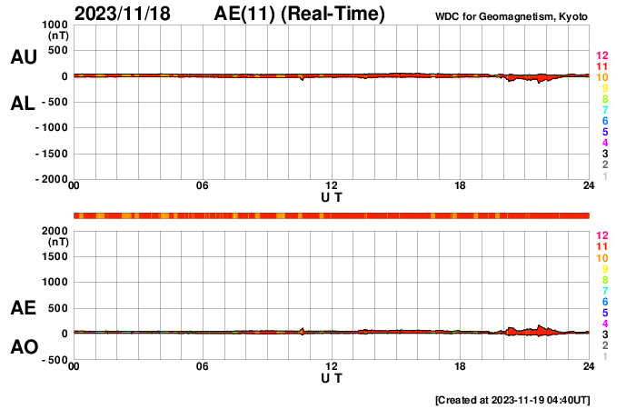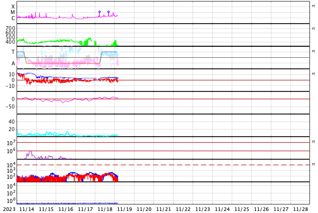 2023/11/19 13:43 更新 太陽風は低速で、磁気圏は穏やかです。Mフレアが3回発生しました。 担当 篠原 太陽風の速度は、300km/秒から、 グラフの最後で330km/秒に少し上がっていますが、 低速の状態が続いています。 磁場強度は、4〜5nTと平均的な状態です。 磁気圏は静穏で、 AE指数は変化のない状態が続いています。 SDO衛星AIA193は、 中心部に目立つ規模のコロナホールはなく、 太陽風は穏やかな状態が続きそうです。 太陽は、昨日注目した北東の端(左上)で活動が続く様になり、 昨日の午後から今朝にかけて、 M1.2、M1.1、M1.0と中規模フレアが3回発生しています。 M1.1以降の活動の様子を、 SDO衛星AIA131の動画で紹介します。 可視光写真では、黒点の広がりが見え始めたところです。 この後の活動に注目してください。 また、GOES衛星SUVI 304を見ると、 太陽の端のあちこちで、 プロミネンス噴出が発生しています。 この様に続くと、にぎやかな感じがします。