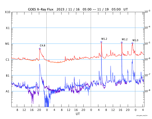 GOES衛星の太陽X線強度。赤・橙 = 0.1〜0.8 nm、青・紫 = 0.05〜0.4 nm (c) データ:NOAA/SWPC、作図:宇宙天気ニュース ![]() | |||||||||||||||||||||||||||||||||||||||||||||||||||||||||||||||||||||||||||||||||||||||||||||||||||||||||||||||||||||||||||||||||||||||||||||||||||||||||||||||||||||||||||||||||||||||||||||||||||||||||||||||||||||||||||||||||||