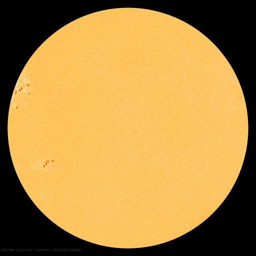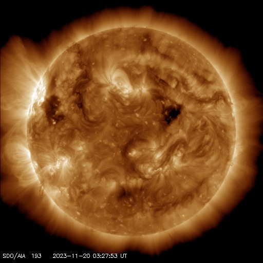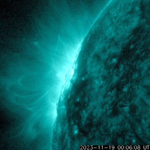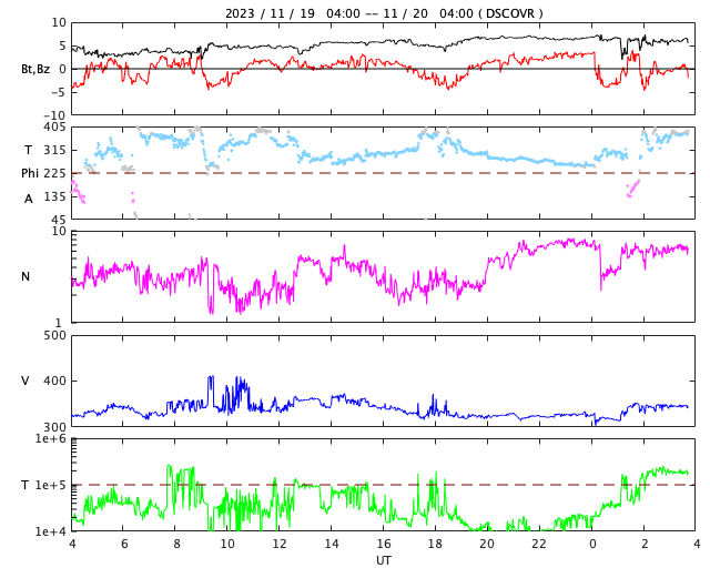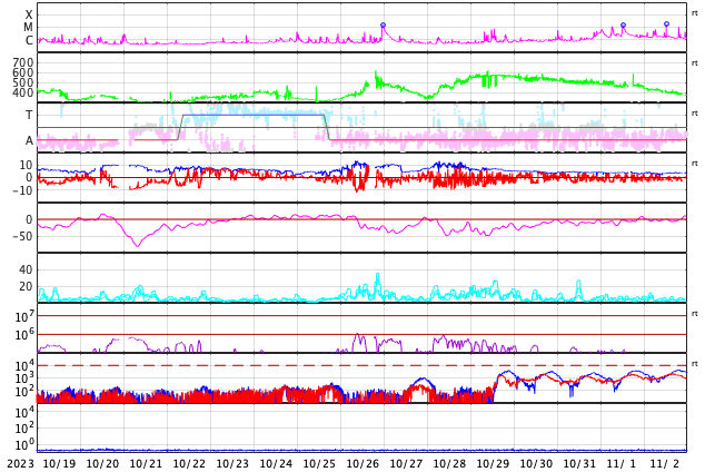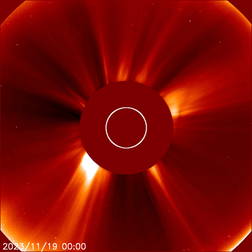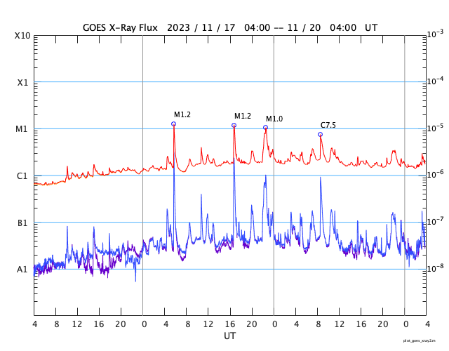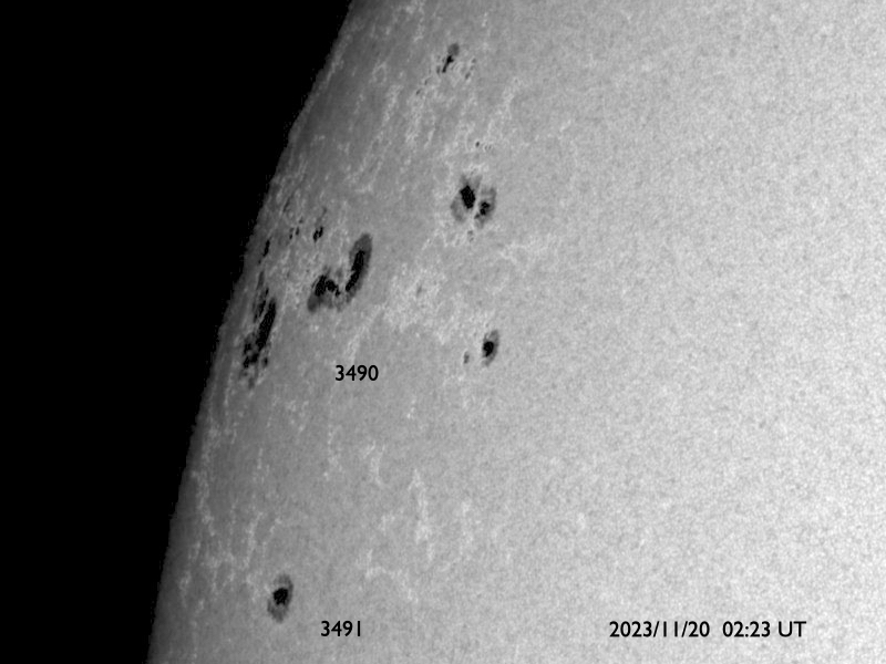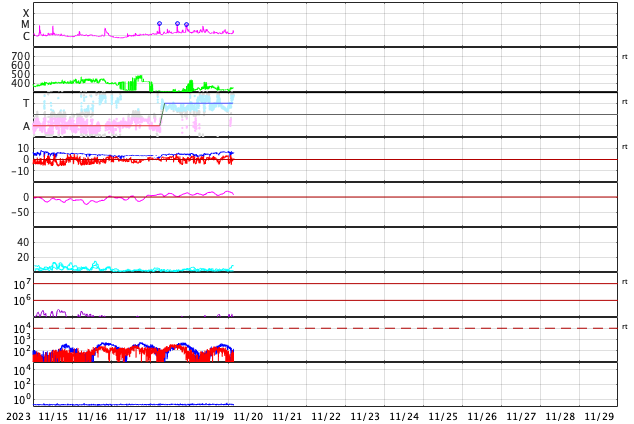 2023/11/20 12:55 更新 太陽の北東の端に黒点が現れています。太陽風は低速です。 担当 篠原 太陽の北東の端(左上)から黒点限が姿を現しています。 SDO衛星の可視光写真の拡大写真を掲載します。 番号は、上側の領域が3490群、下側は3491群です。 昨日のニュース以降もこの領域の活動は続いていますが、 フレアの規模は、C2〜3に留まっています。 それでも、SDO衛星AIA131による動画を見ると、 頻繁に明るい輝きが発生しています。 引き続き注意が必要です。 X線グラフで最大の変化になっている C7.5の小規模フレアは、 南東側(左下)の3489群で発生しています。 また、昨日のニュースで紹介した 南東の端のプロミネンス噴出により、 CME(コロナ質量放出)が発生しています。 SOHO衛星LASCO C2、C3の動画を掲載します。 地球に対して横向きの噴出なので、影響はありません。 太陽風は、320〜350km/秒と低速の風が続いています。 磁場強度は、5〜6nTと平均的な状態です。 磁場の南北成分は、0nT付近で小さく変化しています。 速度が下がっていることもあり、磁気圏は穏やかです。 AE指数は小さい変化が見られる程度です。 SDO衛星AIA193では、 北東側にコロナホールが見え始めています。 27日前と比べると広がりが小さくなっている様です。 もう2日ほど経つと、広がりが良く見える様になるでしょう。 ![]() 太陽の北東の端に現れた黒点群。 (c) SDO衛星HMII (NASA)、作図:宇宙天気ニュース ![]() 3490、3491黒点群の活動の様子。 (c) SDO衛星AIA131 (NASA)、(動画加工 : 宇宙天気ニュース) ![]() 太陽の左下へ噴出するCME。 (c) SOHO衛星LASCO C2、C3 (ESA & NASA)、(動画加工 : 宇宙天気ニュース) ![]() SDO衛星のAIA193カメラによる太陽コロナの様子 (c) SDO (NASA) ![]() SDO衛星による太陽の可視光写真。マウスの矢印を写真に重ねると、黒点番号付きの写真に切り替わります。 (c) SDO (NASA) ![]() GOES衛星の太陽X線強度。赤・橙 = 0.1〜0.8 nm、青・紫 = 0.05〜0.4 nm (c) データ:NOAA/SWPC、作図:宇宙天気ニュース ![]() DSCOVRが観測した太陽風の磁場(黒線は全体の強度、赤線は南北成分) 磁場の向き、プラズマの密度、速度、温度 (c) データ:NOAA/SWPC、作図:宇宙天気ニュース ![]() AE指数(速報値) 下段のAEグラフの値が高くなると、オーロラ活動が活発化しています。 (c) 京都大学WDC ![]() ![]() 27日の太陽周期に合わせた図 太陽が同じ面を地球に向けていた27日前の変化から、今後を予想することができます。 (c) 作図:宇宙天気ニュース