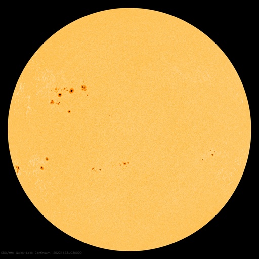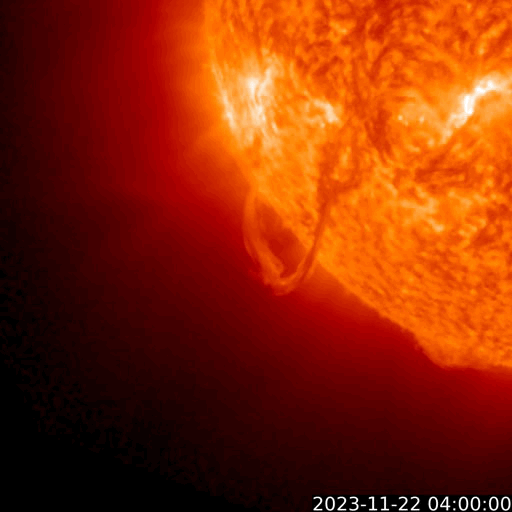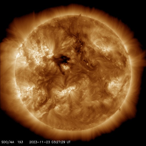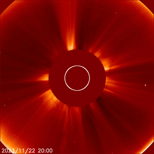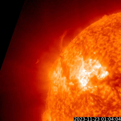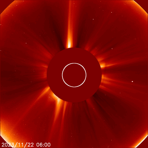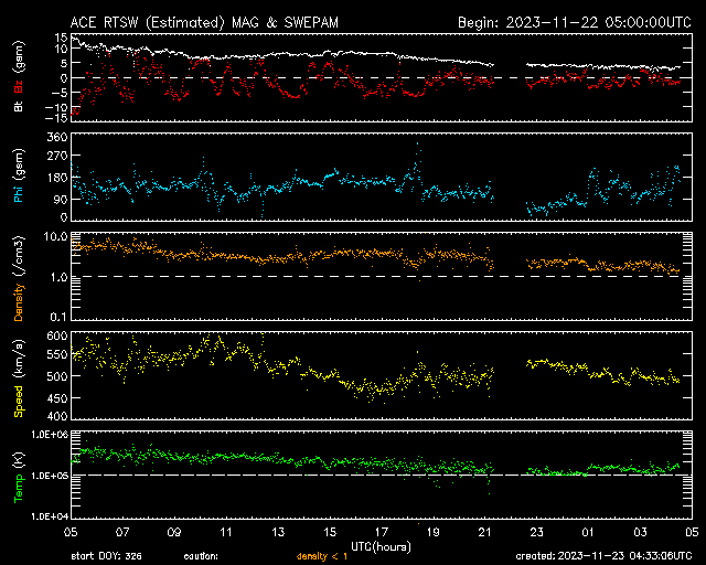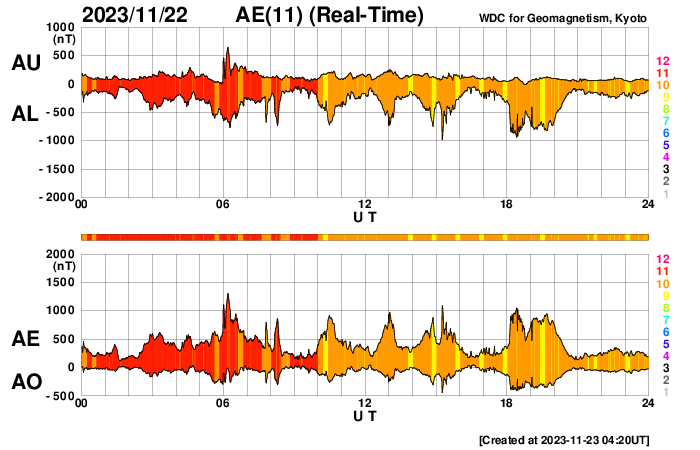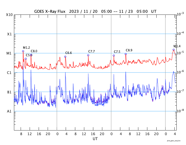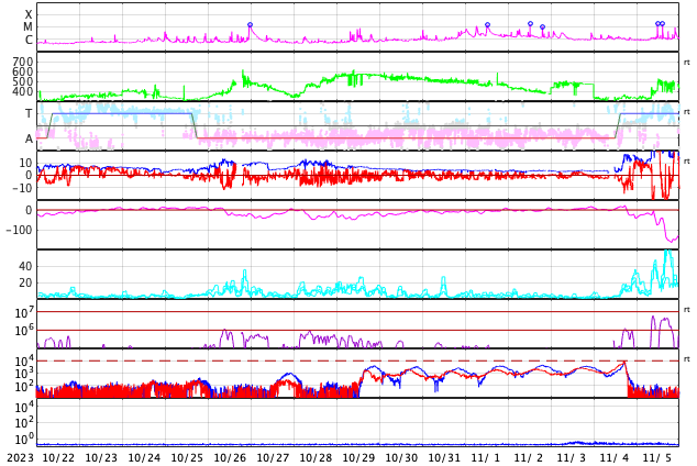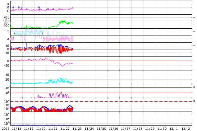 2023/11/23 13:31 更新 太陽の活動が続いています。太陽風は高速です。 担当 篠原 昨日のニュースで指摘していた太陽の南東側(左下)で、 22日15時(世界時22日6時)頃に プロミネンス噴出が発生しました。 GOES衛星SUVI 304の動画を掲載します。 この噴出により、CME(コロナ質量放出)が 太陽の左下に向かって発生しています。 SOHO衛星LASCO C2、C3の動画を掲載します。 地球に対して横向きの噴出なので、影響はありません。 そして、今朝、23日6時半(世界時22日21時半)には、 太陽の右下に広がるCMEが観測されています。 太陽のこちら側では特に変化が起きていないので、 太陽の向こう側で発生した現象の様です。 そして、23日12時(世界時23日3時)に、 太陽の北東の端の少し向こう側(左上)で、 M1.4の中規模フレアが発生しました。 SDO衛星AIA131の動画を掲載します。 GOES衛星SUVI 304を見ると、 このフレアに伴ってプロミネンスの噴出が発生しています。 太陽の左上にCMEも噴出しているでしょう。 その動画は、明日紹介できると思います。 急に太陽がにぎやかになっています。 一方、注目していた北東側の3492黒点群の領域では、 C8.9、C6.3などの小規模フレアが発生していますが、 X線グラフは、目立つ程の変化にはなっていません。 太陽風は、速度が550km/秒から500km/秒へ少し下がっていますが、 高速の状態は続いています。 磁場強度は10nTから3nTへ下がっていて、 やや弱くなっています。 磁場の南北成分は、今朝にかけて、 -5nT程度の南向きの変化が頻繁に発生しました。 速度の高まりもあって、磁気圏の活動は強まり、 AE指数は1000nT前後の大きい変化が繰り返し発生しています。 今朝以降は磁場強度が下がって来たため、 磁場の南向きの変化は小さくなり、 高速の状態は続いていますが、 AE指数の変化は小さくなっています。 この後は、落ち着いた状態になりそうです。