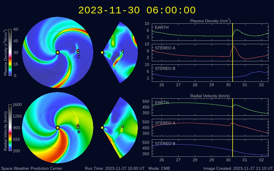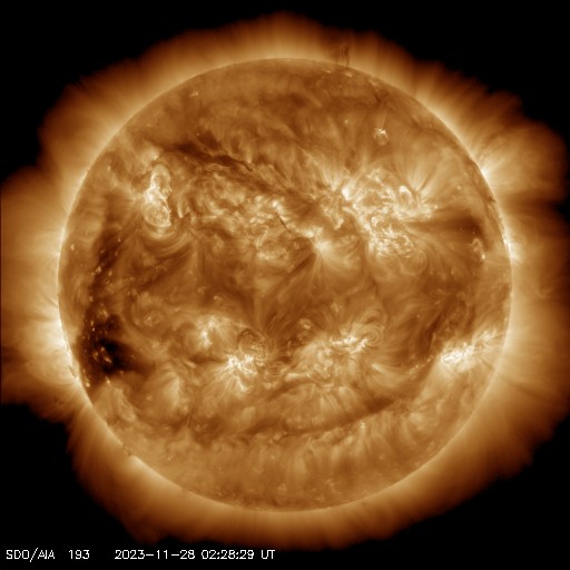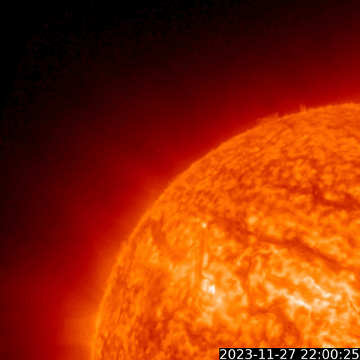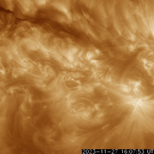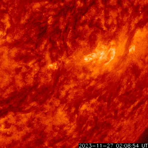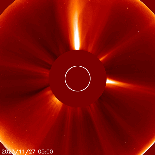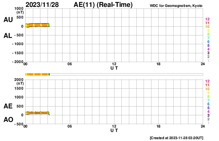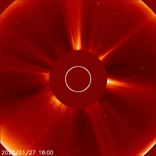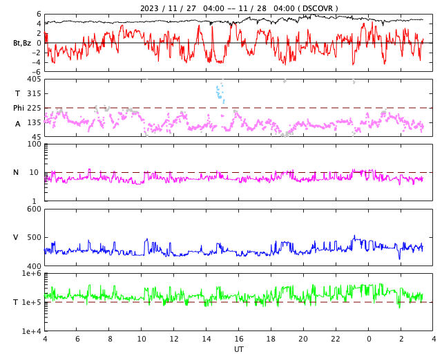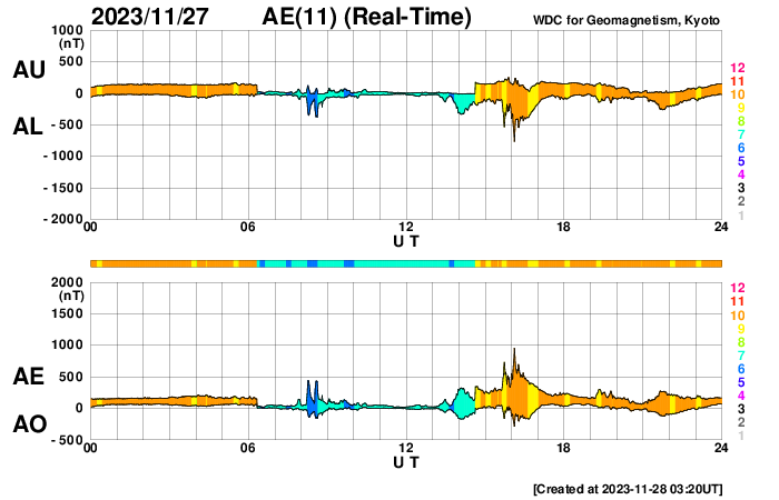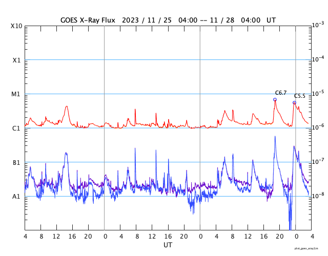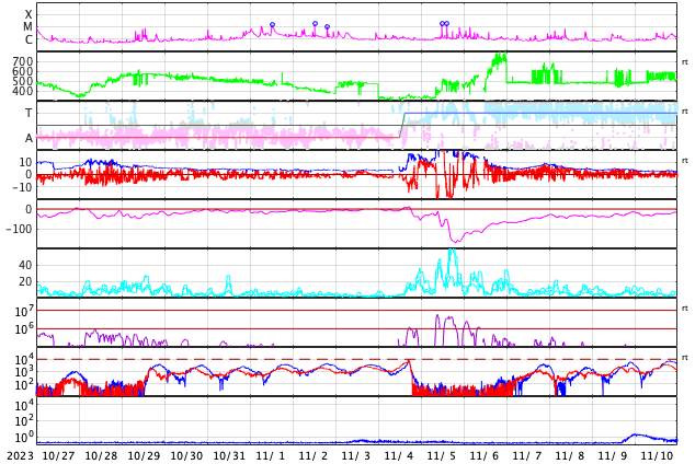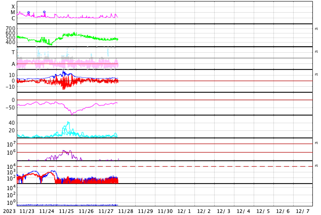 2023/11/28 12:31 更新 CMEが連続して発生し、太陽風の乱れが到来する可能性があります。 担当 篠原 太陽で活動が連続しています。 1つめは、昨日の昼、27日14時(世界時27日5時)に、 南西側(右下)でフィラメント噴出が発生しました。 SDO衛星SUVI304の動画を掲載します。 薄暗い筋として見えるダークフィラメントが、 右下に向かって飛び出しています。 SOHO衛星LASCO C2、C3では、 CME(コロナ質量放出)が観測されています。 NOAA/SWPCの太陽風予報によると、 このCMEによる太陽風の乱れが 明後日の午後、30日15時(世界時30日6時)頃に 到来する可能性があるとのことです。 そして、今日未明、28日3時半(世界時27日18時半)に、 中心部北側でC3.8の小規模フレアが発生し、 今朝、28日8時世界時27日23時)には 北東(左上)の3503黒点群で C5.5の小規模フレアが発生しています。 SDO衛星AIA193による2つのフレアの動画と、 GOES衛星SUVI 304によるC5.5のフレアの動画を掲載します。 コロナが大きく動く様子が見えています。 SOHO衛星LASCO C2では、 左下に向かう淡いCMEと左上に向かうCMEが見えています。 噴出の発生場所を考えると、 これらの噴出による太陽風の乱れも 地球にやって来る可能性がありそうです。 その場合、最初のCMEに続く様に12月1日頃の到来でしょうか。 NOAA/SWPCの今後の予報に注目してください。 太陽では、C3.8とほぼ同時の28日3時半(世界時27日18時半)に 中心部南側の3500群でC6.7の小規模フレアが発生しています。 X線の強度はこちらの方が大きいのですが、 コロナの動く様子を見ると、CMEの原因はC3.8の様に思います。 太陽風は、450km/秒前後と平均的な速度になっています。 磁場強度も4〜5nTと平均的な状態です。 磁場の南北成分は細かく南北に変化しています。 磁気圏は概ね静穏で、 AE指数は基本的には変化が小さく、 時々、強まる変化が発生しています。