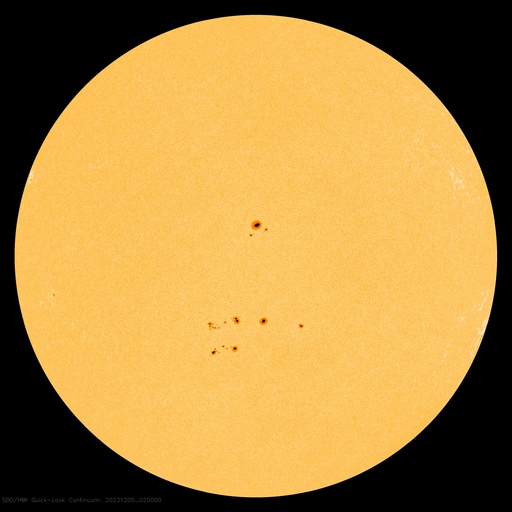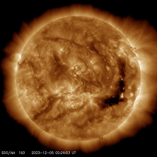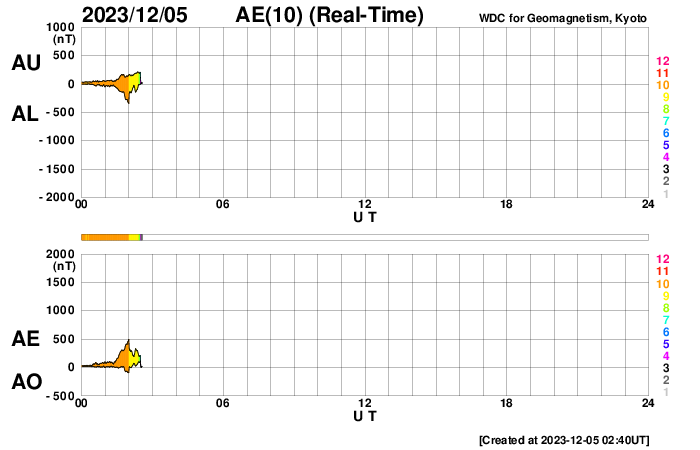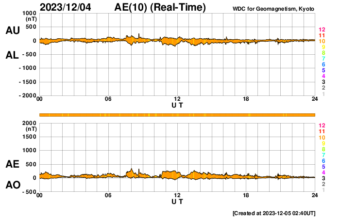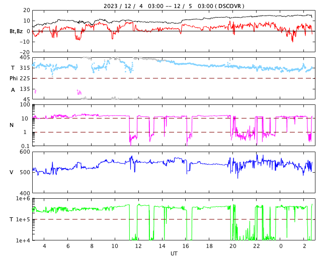 2023/12/ 5 11:58 更新 高速の太陽風が続いています。磁気圏は比較的穏やかです。 担当 篠原 太陽風の速度は、 昨日の夕方に500km/秒から550km/秒へ高まり、 現在までこの状態が続いています。 磁場強度は、昨日の午後に10nTへ強まり、 今日に入った頃からさらに上昇して、 現在は15nTに強まっています。 太陽風磁場の南北成分は、 北寄りの傾向が続いています。 速度は高まっていますが、磁気圏への影響は限定的で、 AE指数は小規模の変化が見られる程度です。 コロナホールの影響が続いています。 SDO衛星AIA193の太陽コロナ写真では、 西側の半分くらいまで進んでいて、 現在が一番強まっているところかもしれません。 前周期の太陽風速度の高まりは、 11月6日から11日にかけて続きました。 今回は何日くらい続くでしょうか。 太陽は、南西の端(右下)の3500黒点群で C4.7の小規模フレア、 北東の端(左上)の領域で C3.9、C3.0の小規模フレアが発生しています。 大きい変化ではありませんが、 北東の端の領域はこれからこちら側を進むので、 注目してください。 ![]() SDO衛星のAIA193カメラによる太陽コロナの様子 (c) SDO (NASA) ![]() SDO衛星による太陽の可視光写真。マウスの矢印を写真に重ねると、黒点番号付きの写真に切り替わります。 (c) SDO (NASA) ![]() DSCOVRが観測した太陽風の磁場(黒線は全体の強度、赤線は南北成分) 磁場の向き、プラズマの密度、速度、温度 (c) データ:NOAA/SWPC、作図:宇宙天気ニュース ![]() AE指数(速報値) 下段のAEグラフの値が高くなると、オーロラ活動が活発化しています。 (c) 京都大学WDC ![]() ![]() 27日の太陽周期に合わせた図 太陽が同じ面を地球に向けていた27日前の変化から、今後を予想することができます。 (c) 作図:宇宙天気ニュース