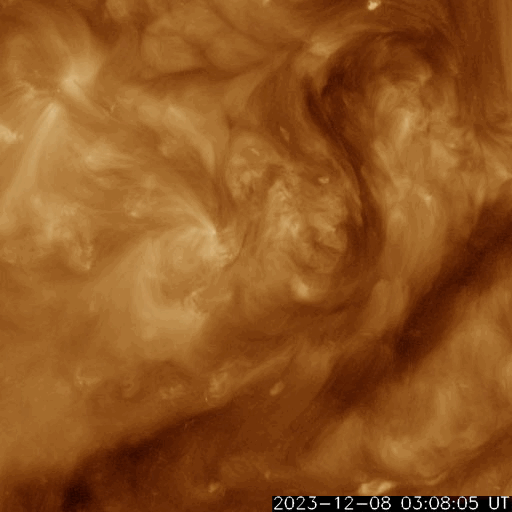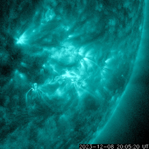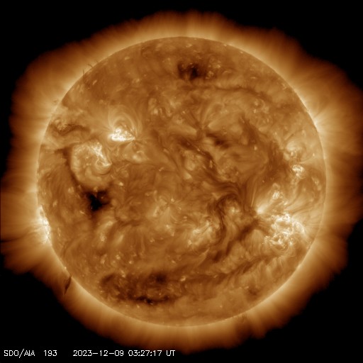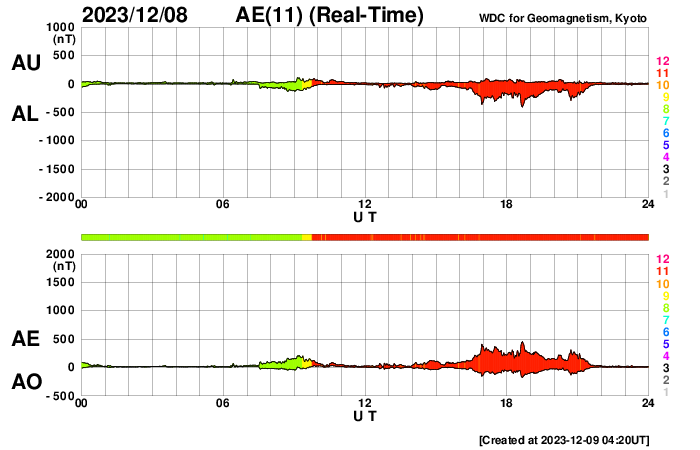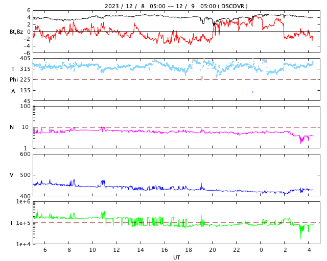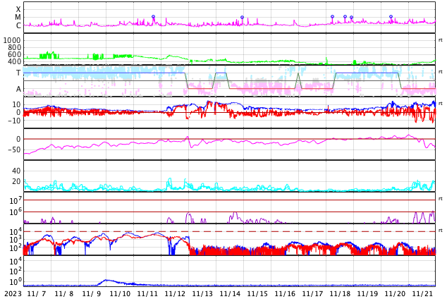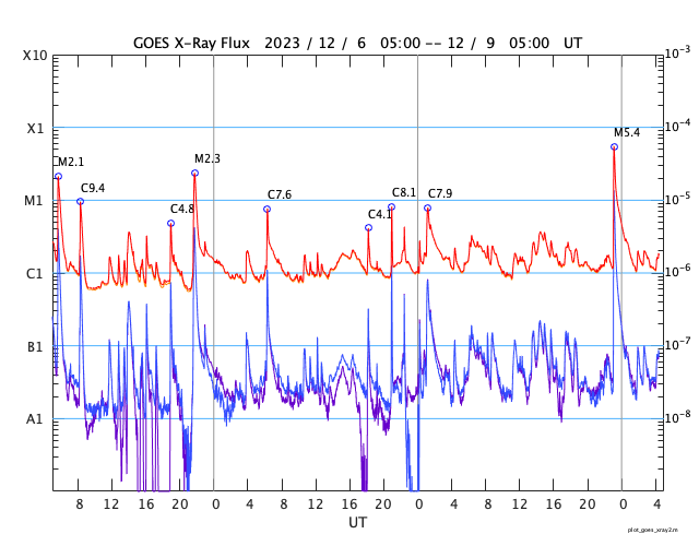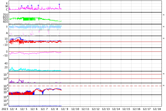 2023/12/ 9 13:31 更新 M5.4の中規模フレアが発生しました。太陽風は平均的な状態です。 担当 篠原 今朝、9日8時(世界時8日23時)に、 太陽の南西側(右下)の3511黒点群で、 M5.4の中規模フレアが発生しました。 SDO衛星AIA131の動画を掲載します。 3511群は、昨日の午後から C2〜3の小規模フレアの発生が続く様になっていました。 この後も活動は続くでしょうか。 一方、北東側(左上)の3513群は、 C2程度の小規模フレアが数回発生していますが、 活動は落ち着いて来た印象です。 また、中心部南側(下側)で、 8日14時(世界時8日5時)頃に フィラメント噴出が発生しています。 規模は小さいですが、中心付近で発生しているので、 磁場の強まりなどの太陽風の乱れが到来する可能性があります。 その場合、12日頃でしょうか。 太陽風は、速度が450km/秒から420km/秒に少し下がっていますが、 平均的な状態が続いています。 磁場強度も、4〜5nTと平均的な状態です。 磁気圏は基本的に穏やかですが、 太陽風の磁場が南寄りになった頃に、 AE指数に小規模の変化が起きています。 SDO衛星AiA193では、 東側(左側)の赤道付近に小さいコロナホールが見えています。 太陽風速度の高まりがやって来るでしょうか。