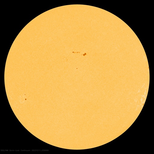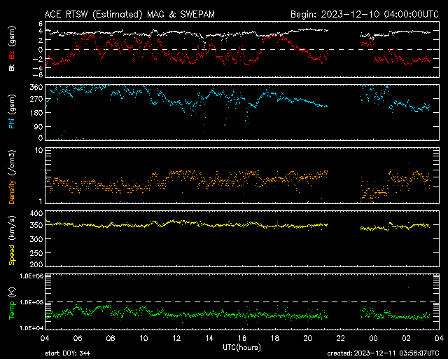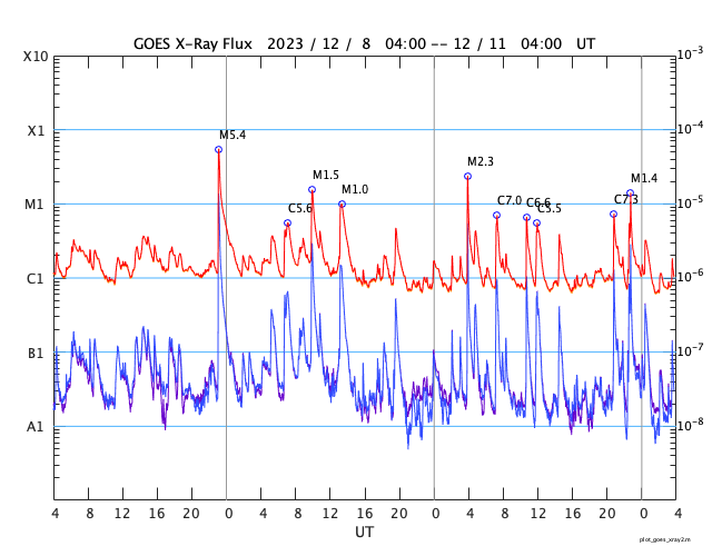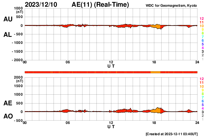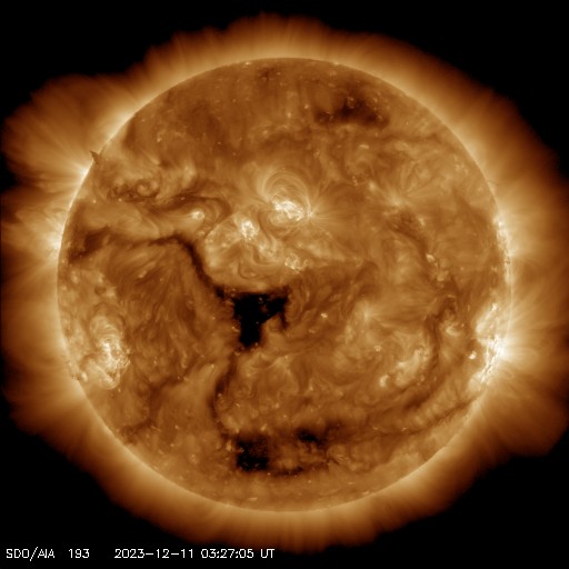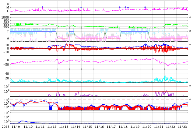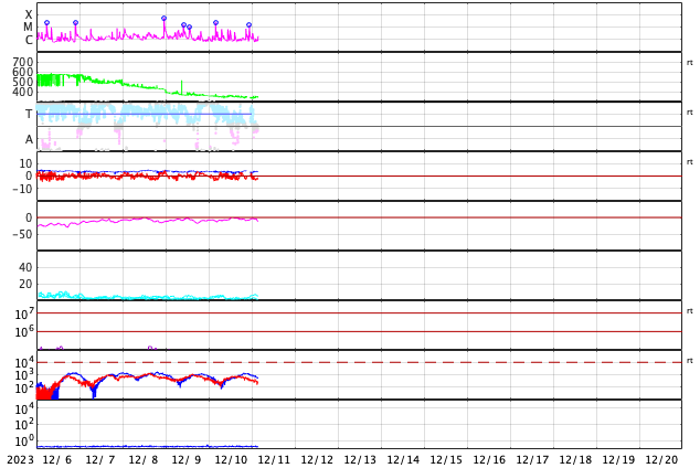2023/12/11 12:57 更新 3511黒点群のフレアが続いています。太陽風は低速です。 担当 篠原 宇宙天気の話題ではありませんが、 SOHO衛星LASCO C3のコロナグラフの下側から 小型の彗星が太陽に近付いています。 この後、C2でも見える様になるでしょう。 注目して下さい。 太陽は、南西の端(右下)に達した3511黒点群の 活動が続いています。 昨日のニュース以降、 C7.0、C6.6、C5.5、C7.3などの小規模フレアを起こし、 今朝、11日7時半(世界時10日22時半)には、 M1.4の中規模フレアが発生しています。 3511群は、この後西の端に沈んで見えなくなります。 その他の領域では、中心部北側(上側)の3513群で、 小さい活動が続いています。 規模が大きくなる様な変化が見られるでしょうか。 太陽風は、350km/秒と低速の値になっています。 磁場強度は、3〜4nTとやや弱くなっています。 磁場の南北成分は、小さく南北に変化していますが、 低速のため磁気圏は概ね静穏で、 AE指数は小さい変化が時々見られる程度です。 SDO衛星AIA193では、コロナホールが太陽の中心に達しています。 広がりは小さいですが、 3日後くらいに太陽風速度の高まりが見られるかもしれません。 27日前の前周期には見えなかった領域で、 太陽風も低速の状態でした。 今回はどの様な変化になるでしょうか。 ![]() 小型の彗星が太陽に近付いています。 (c) SOHO衛星LASCO C3 (ESA & NASA)、(動画加工 : 宇宙天気ニュース) ![]() SDO衛星のAIA193カメラによる太陽コロナの様子 (c) SDO (NASA) ![]() SDO衛星による太陽の可視光写真。マウスの矢印を写真に重ねると、黒点番号付きの写真に切り替わります。 (c) SDO (NASA) ![]() GOES衛星の太陽X線強度。赤・橙 = 0.1〜0.8 nm、青・紫 = 0.05〜0.4 nm (c) データ:NOAA/SWPC、作図:宇宙天気ニュース ![]() ACEが観測した太陽風の磁場(1番上の枠、白線は全体の強度、赤線は南北成分) および、太陽風の密度(3番目の橙線)、速度(4番目の黄線) (c) NOAA/SWPC ![]() AE指数(速報値) 下段のAEグラフの値が高くなると、オーロラ活動が活発化しています。 (c) 京都大学WDC ![]() ![]() 27日の太陽周期に合わせた図 太陽が同じ面を地球に向けていた27日前の変化から、今後を予想することができます。 (c) 作図:宇宙天気ニュース