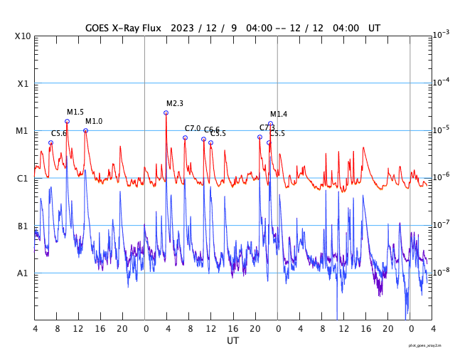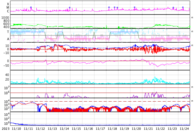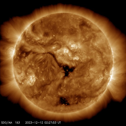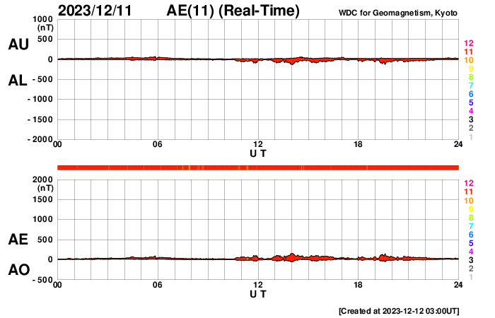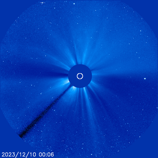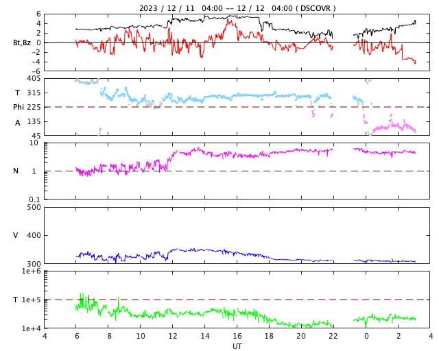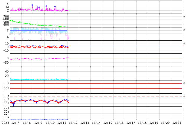 2023/12/12 12:16 更新 小型の彗星が太陽に近付いています。太陽風は低速で、磁気圏は穏やかです。 担当 篠原 昨日紹介した小型の彗星は、太陽に更に近付いています。 それと共に尾が伸びて、彗星らしくなっています。 通り抜けた後、再びSOHO衛星のカメラで見えるでしょうか。 太陽は、3511黒点群の活動の規模が小さくなっています。 昨夜遅くにかけて、C3.3、C3.6、C3.7、C4.4などの 小規模フレアが発生していましたが、 その後は目立った変化を起こしていません。 3511群は、太陽の西の端に沈んで見えなくなります。 一方、中心部の3514群で小さい活動が見られる様になっています。 活動の規模は大きくなるでしょうか。 太陽風は、速度が310km/秒に下がり、 更に低速の風になっています。 磁場強度は、途中で上下していますが、 4nT前後の平均的な状態です。 磁気圏は静穏で、AE指数はほとんど変化のない状態です。 SDO衛星AIA193の太陽コロナ写真は、 中心部にコロナホールが見えています。 2〜3日後くらいから太陽風の速度が高まるかもしれません。
