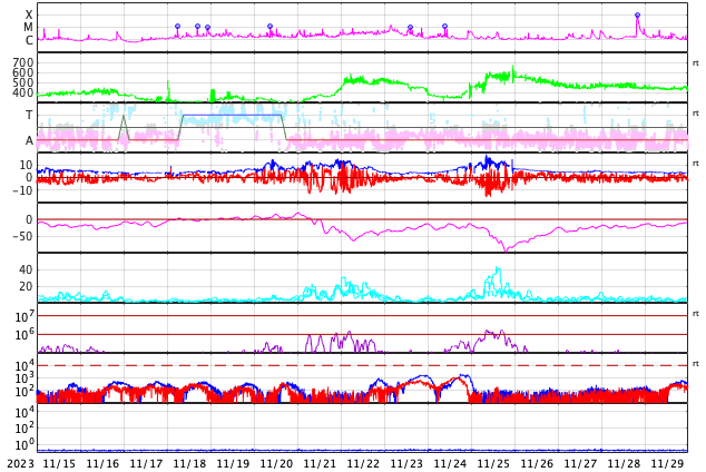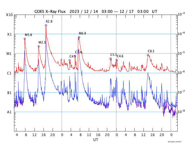 GOES衛星の太陽X線強度。赤・橙 = 0.1〜0.8 nm、青・紫 = 0.05〜0.4 nm (c) データ:NOAA/SWPC、作図:宇宙天気ニュース ![]() | ||||||||||||||||||||||||||||||||||||||||||||||||||||||||||||||||||||||||||||||||||||||||||||||||||||||||||||||||||||||||||||||||||||||||||||||||||||||||||||||||||||||||||||||||||||||||||||||||||||||||||||||||||||||||||||||||||||||||||||||||||||||||||||||||||||||||||||||||||||||||||||||||||||||||||||||||