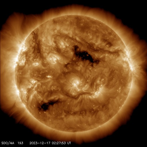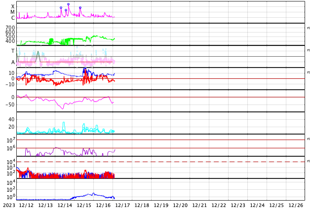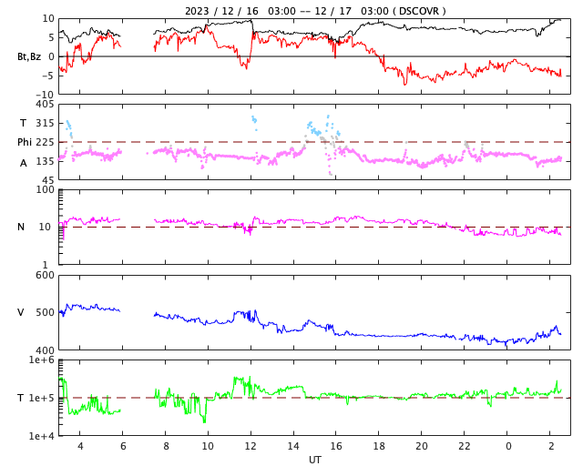 2023/12/17 11:48 更新 太陽風は平均的な速度です。乱れはまだ到来していません。 担当 篠原 X2.8大規模フレアに関係する太陽風の乱れは まだ到来していません。 太陽風の速度は、 500km/秒から420km/秒へゆっくり下がり、 最後で460km/秒に少し上がっています。 現在は平均的な速さです。 磁場強度は、6〜9nTの間を上下していて、 やや強い状態です。 磁場の南北成分は、 太陽風のグラフの前半は北寄りで、 今朝くらいから南寄りに変わっています。 AE指数が参照できない状態なのですが、 磁場が南寄りになっているため、 現在の磁気圏では、 小規模の活動が見られる様になっているのではないでしょうか。 この後、CME(コロナ質量放出)による 太陽風の乱れが到来すると思われます。 到来が遅れれば、速度の高まりはより小幅になるでしょう。 一方、磁気圏活動には磁場の南向きの変化が大きく影響します。 この後の太陽風の変化に注目して下さい。 太陽は、西の端(右端)に近付いた3514黒点群で、 C3.6、C8.3、C8.1、C3.2など、 小規模フレアの発生が続いています。 この後、向こう側に進んで見えなくなります。 その他の領域では目立つ活動はなく、 太陽は穏やかになりそうです。