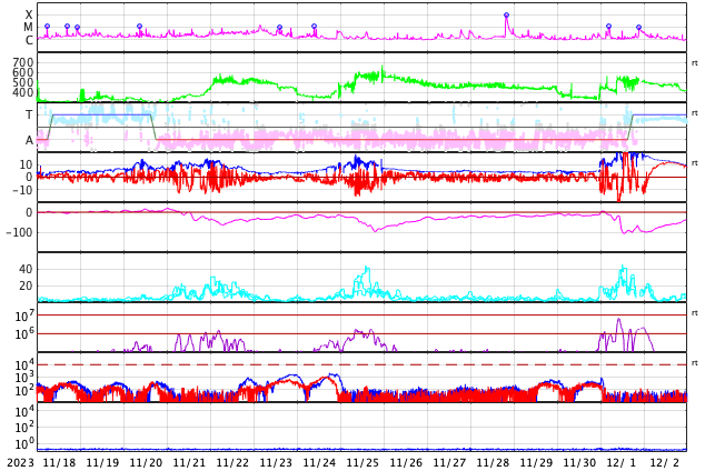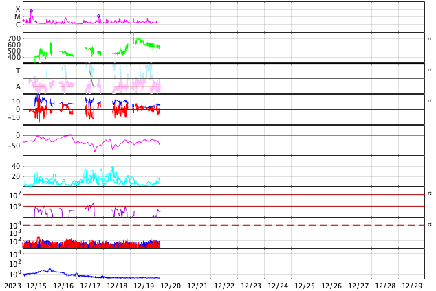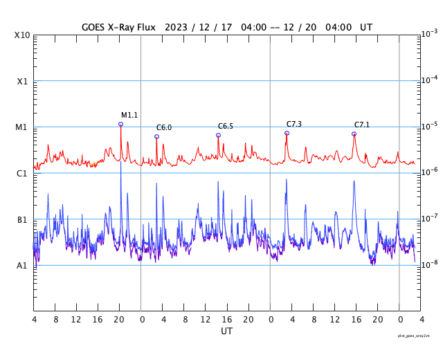 GOES衛星の太陽X線強度。赤・橙 = 0.1〜0.8 nm、青・紫 = 0.05〜0.4 nm (c) データ:NOAA/SWPC、作図:宇宙天気ニュース ![]() | ||||||||||||||||||||||||||||||||||||||||||||||||||||||||||||||||||||||||||||||||||||||||||||||||||||||||||||||||||||||||||||||||||||||||||||||||||||||||||||||||||||||||||||||||||||||||||||||||||||||||||||||||||||||||||||||||||||||||||||||||||||||||||||||||||||||||||||||||||