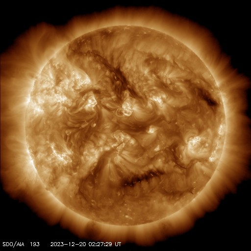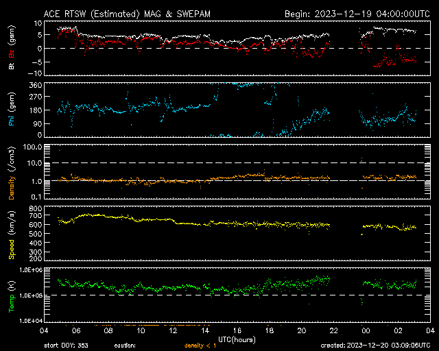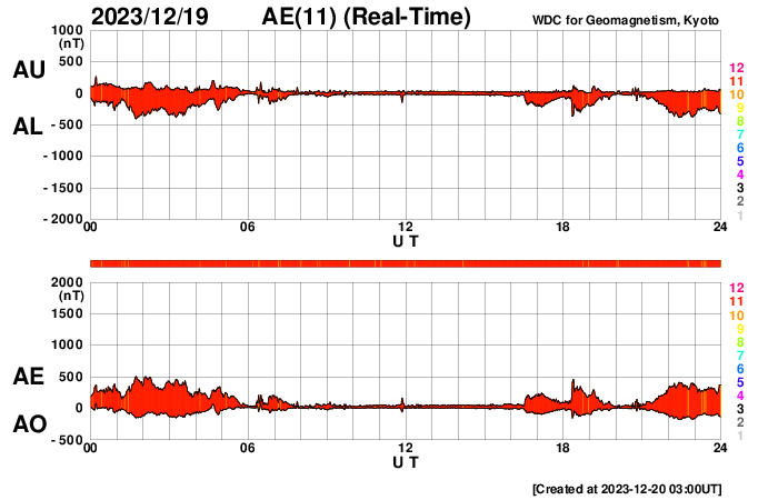 2023/12/20 12:10 更新 高速の太陽風が続いています。磁気圏はやや活動的です。 担当 篠原 太陽風は、600km/秒前後に高まった状態が続いていました。 グラフの最後で550km/秒に下がる変化が見えていますが、 高速の状態は続いています。 磁場強度は4nT付近で推移して、 こちらはグラフの最後で7nTへ少し強まっています。 磁場の南北成分は、グラフの中盤までは北向きで、 その後、南への変化が見られる様になり、 最後の磁場の強まり以降は、 -5nTを超えるくらいの南向きの変化になっています。 磁気圏の活動はこの変化に対応して、 AE指数は、1枚目の中盤は変化がありませんが、 その後小規模の変化が見られる様になり、 最後に600nTの中規模の変化が発生しています。 太陽風磁場の南寄りの傾向が続けば、 磁気圏の活動も高まった状態が続くでしょう。 SDO衛星AIA193では、 北西側(右上)のコロナホールは西の端に近付いています。 太陽風速度の高まりは、 この後弱くなって行くのではないでしょうか。 27日周期の図を見ると、前周期の太陽風の高まりは、 11月22〜23日の2日間になっています。 太陽は、南東(左下)の3529黒点群で、 C7.1の小規模フレアが発生しました。 また、北東側(左上)のあちこちで 小さい活動が度々発生しています。 活動の強まりに繋がるでしょうか。 ![]() SDO衛星のAIA193カメラによる太陽コロナの様子 (c) SDO (NASA) ![]() SDO衛星による太陽の可視光写真。マウスの矢印を写真に重ねると、黒点番号付きの写真に切り替わります。 (c) SDO (NASA) ![]() ACEが観測した太陽風の磁場(1番上の枠、白線は全体の強度、赤線は南北成分) および、太陽風の密度(3番目の橙線)、速度(4番目の黄線) (c) NOAA/SWPC ![]() AE指数(速報値) 下段のAEグラフの値が高くなると、オーロラ活動が活発化しています。 (c) 京都大学WDC ![]() ![]() 27日の太陽周期に合わせた図 太陽が同じ面を地球に向けていた27日前の変化から、今後を予想することができます。 (c) 作図:宇宙天気ニュース