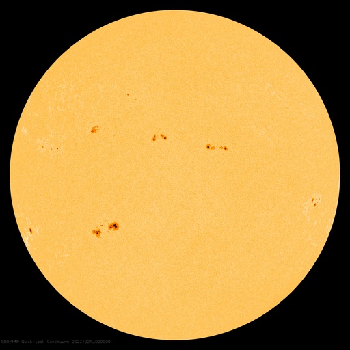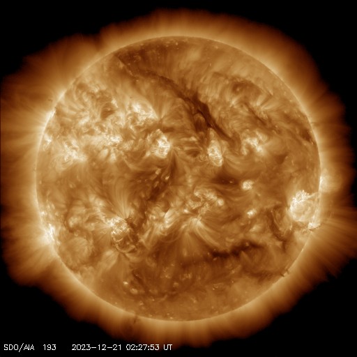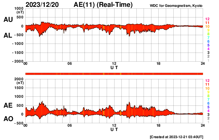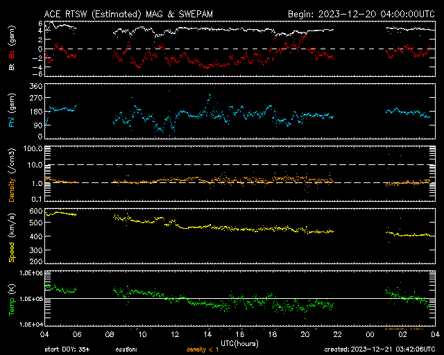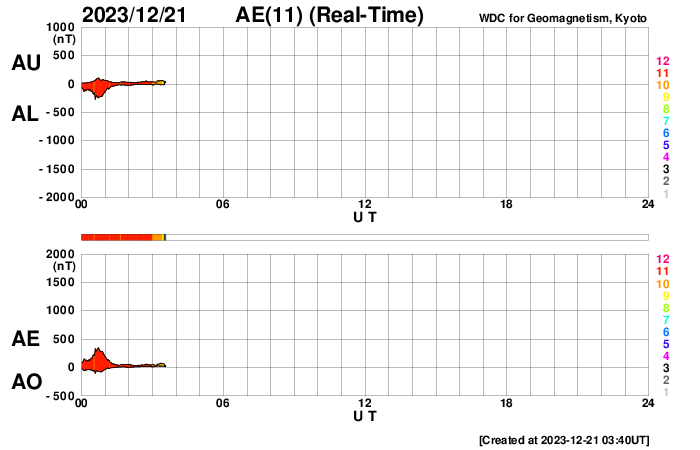 2023/12/21 12:41 更新 太陽風は平均的な状態に戻っています。Cフレアが続いています。 担当 篠原 太陽風の速度は、昨夜遅くに500km/秒台を割り、 現在は400km/秒と平均的な速度に戻っています。 磁場強度も、4〜5nTと平均的な状態です。 磁場の南北成分は、 グラフの中盤にかけて南寄りの変化が続き、 磁気圏はやや活動的な状態でした。 AE指数は、300〜500nTの小規模の変化が 連続的に発生しています。 しかし、太陽風のグラフの後半で、 磁場の南北成分は0nT付近で小さく変化する様になり、 AE指数は変化がなくなって、 磁気圏は穏やかになっています。 SDO衛星AIA193では、 南半球に見えていたコロナホールが 南西側(右下)に進んでいます。 この後、この領域の影響は見られるでしょうか。 太陽は、南西の端近くの3519黒点群で、 C7.9、C6.8、C6.5など、 中心部北側(上側)の3521群で、 C7.9、C8.3、C7.2など、 そして、南東(左下)の3529群で C5.4などの小規模フレアが発生しています。 X線グラフは変化が目立つ様になっています。 この後の活動に注目してください。 ![]() SDO衛星のAIA193カメラによる太陽コロナの様子 (c) SDO (NASA) ![]() SDO衛星による太陽の可視光写真。マウスの矢印を写真に重ねると、黒点番号付きの写真に切り替わります。 (c) SDO (NASA) ![]() ACEが観測した太陽風の磁場(1番上の枠、白線は全体の強度、赤線は南北成分) および、太陽風の密度(3番目の橙線)、速度(4番目の黄線) (c) NOAA/SWPC ![]() AE指数(速報値) 下段のAEグラフの値が高くなると、オーロラ活動が活発化しています。 (c) 京都大学WDC ![]() ![]() 27日の太陽周期に合わせた図 太陽が同じ面を地球に向けていた27日前の変化から、今後を予想することができます。 (c) 作図:宇宙天気ニュース