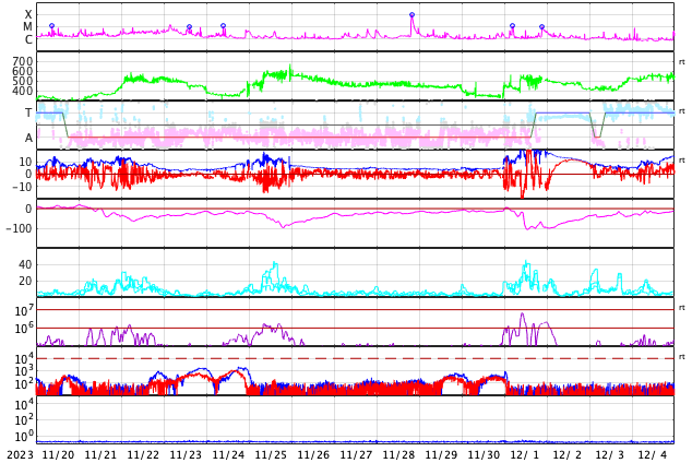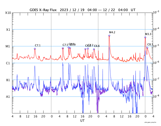 GOES衛星の太陽X線強度。赤・橙 = 0.1〜0.8 nm、青・紫 = 0.05〜0.4 nm (c) データ:NOAA/SWPC、作図:宇宙天気ニュース ![]() | ||||||||||||||||||||||||||||||||||||||||||||||||||||||||||||||||||||||||||||||||||||||||||||||||||||||||||||||||||||||||||||||||||||||||||||||||||||||||||||||||||||||||||||||||||||||||||||||||||||||||||||||||||||||||||||||||||||||||||||||||||||||||||||||||||||||||||||||||||||||||||||||