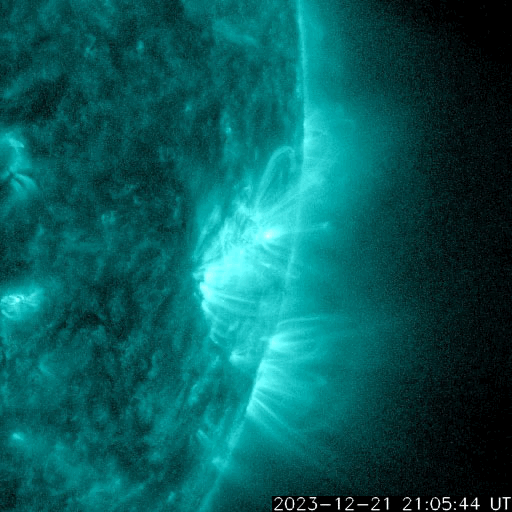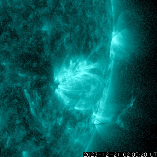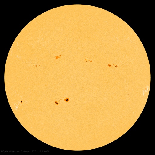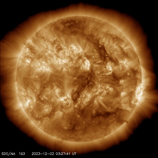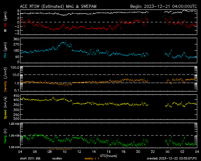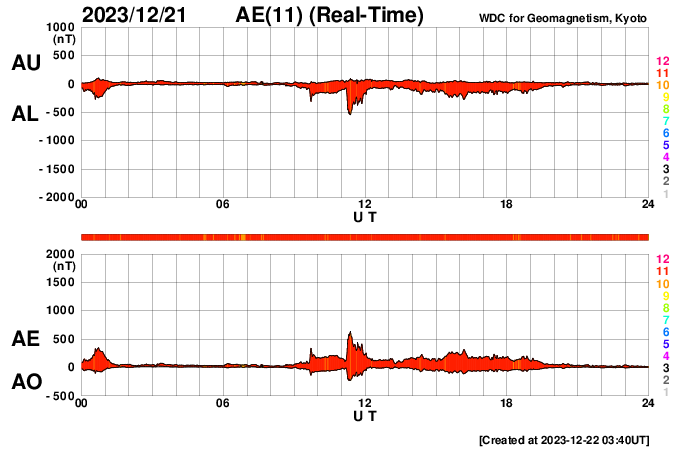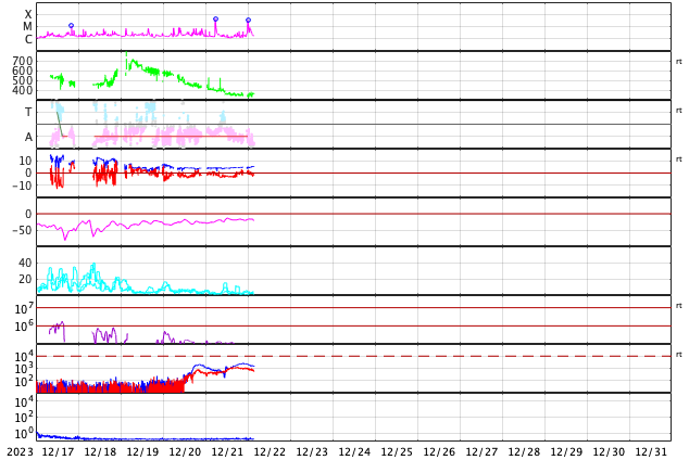 2023/12/22 12:55 更新 太陽風は低速になっています。Mフレアが2回発生しました。 担当 篠原 太陽風の速度は、400km/秒から350km/秒へ下がり、 低速になっています。 磁場強度は、4nTから5nTへ少し上がっていますが、 平均的な状態です。 磁場の南北成分は、 グラフの前半は南寄り、後半は0nT付近となっています。 速度が下がってきたので変化は限定的ですが、 磁場が南寄りだった頃に、 AE指数は小規模の変化が続いています。 その後は変化がなくなり、現在の磁気圏は穏やかです。 SDO衛星AIA193では、 太陽の中心部にコロナホールはありません。 今後の太陽風は、穏やかな状態が続きそうです。 太陽は、南西の端(右下)に達した3519黒点群で、 昨日の午後、21日14時半(世界時21日5時半)にM4.2、 今朝、22日9時(世界時22日0時)にM3.3と、 中規模フレアが2回発生しました。 3519群は、西の端に沈んで行きます。 この後は、北西(右上)の3528群や、 中心部南側(下側)の3529群などに注目してください。