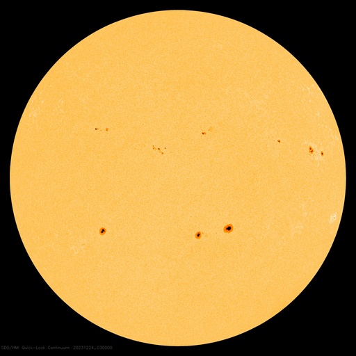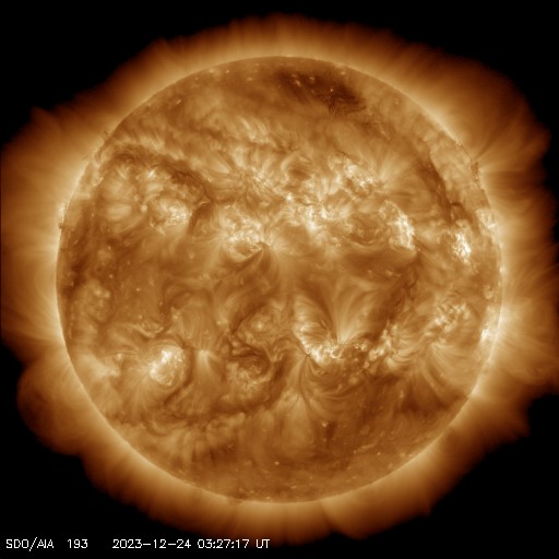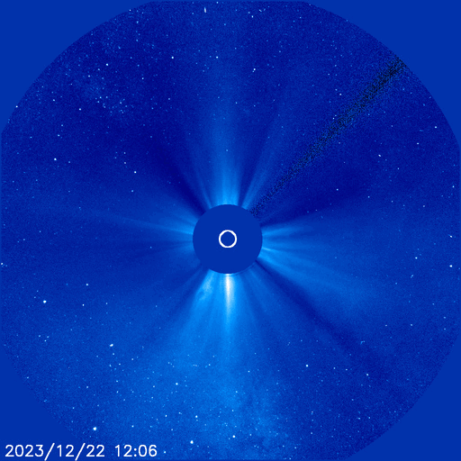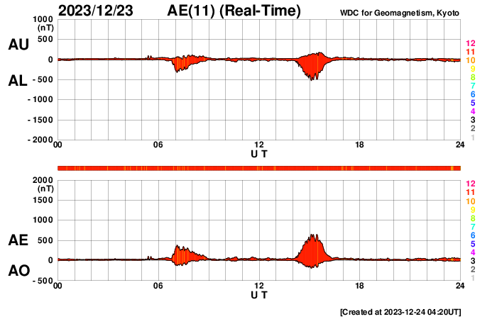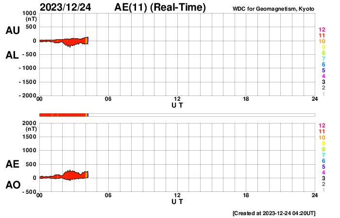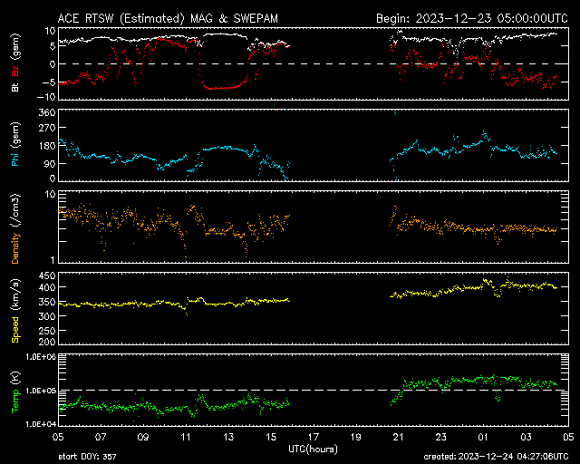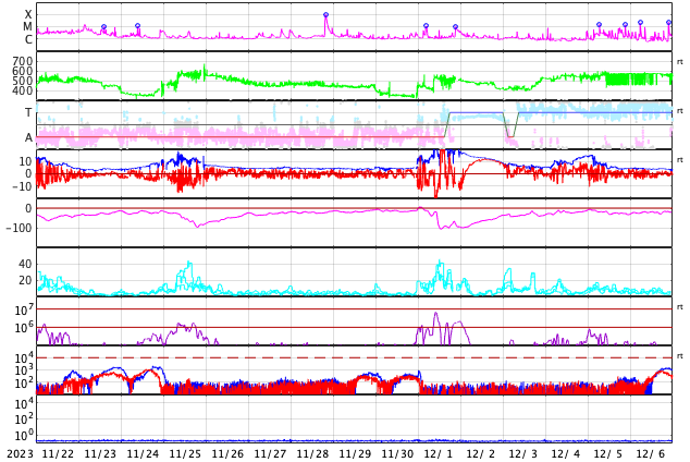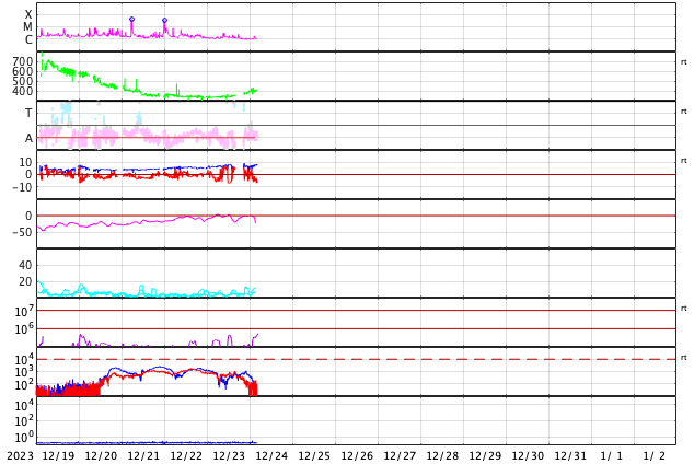 2023/12/24 13:29 更新 太陽風は平均的な速度に戻っています。太陽は穏やかです。 担当 篠原 SOHO衛星LASCO C2、C3で、 太陽に接近する小さい彗星の姿が22日から撮影されています。 12月11〜13日のニュースでも彗星を紹介しましたが、 その時よりも小さい彗星です。 太陽風は、速度が330km/秒から400km/秒へ上がって、 平均的な速さになっています。 磁場強度も6nTから8nTへ上がって、 やや強まっています。 SDO衛星AIA193では、 コロナホールは特に見えていなかったので、 一時的な変化ではないかと思いますが、 もうしばらく様子を見て下さい。 太陽風磁場の南北成分は、 時々南向きに強まる変化が発生していて、 -5nT程度の変化が短い時間発生しています。 この時間帯に磁気圏の活動も強まって、 AE指数では、300nTと600nTの 小、中規模の変化が短い時間発生しています。 太陽風のグラフの最後も-5nTの南向きの変化になっています。 この後、磁気圏活動の強まりが見られそうです。 太陽は、C2〜3の小さい小規模フレアが発生した程度で、 全体としては穏やかです。