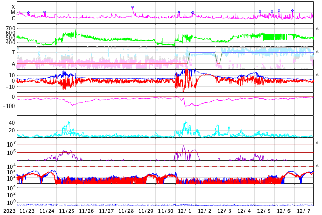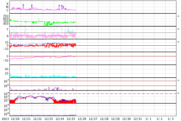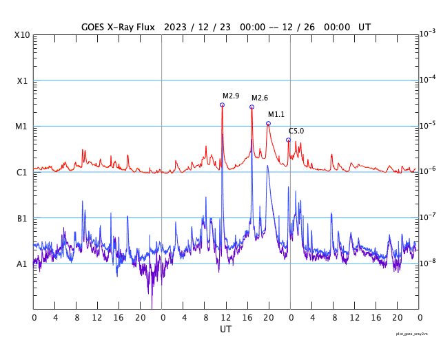 GOES衛星の太陽X線強度。赤・橙 = 0.1〜0.8 nm、青・紫 = 0.05〜0.4 nm (c) データ:NOAA/SWPC、作図:宇宙天気ニュース ![]() | ||||||||||||||||||||||||||||||||||||||||||||||||||||||||||||||||||||||||||||||||||||||||||||||||||||||||||||||||||||||||||||||||||||||||||||||||||||||||||||||||||||||||||||||||||||||||||||||||||||||||||||||||||||||||||||||||||||||||||||||||||||||||||||||||