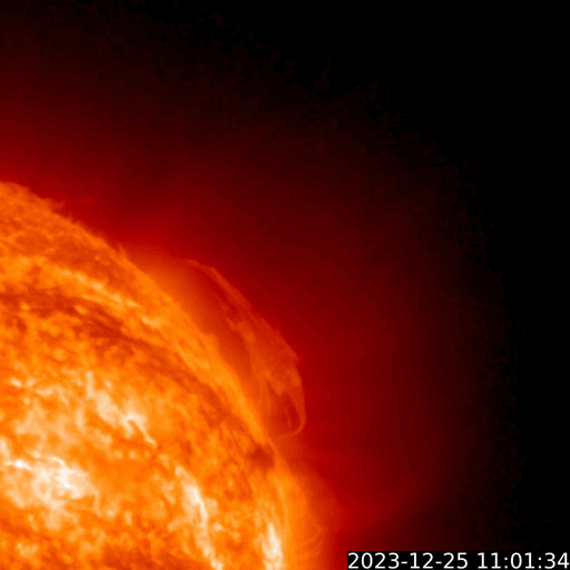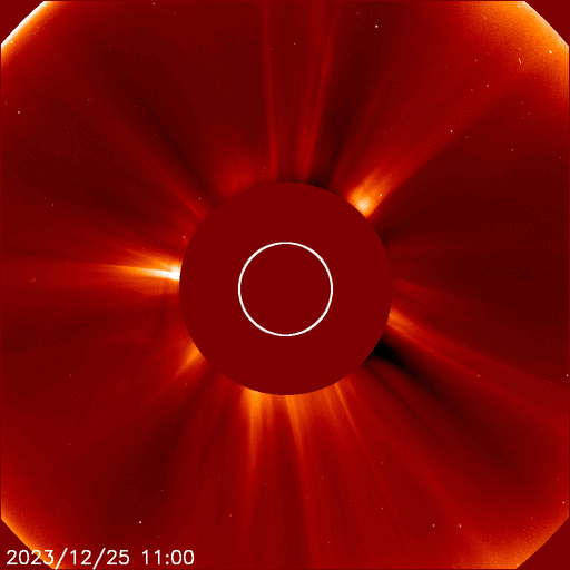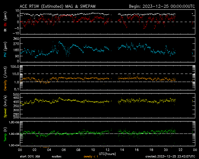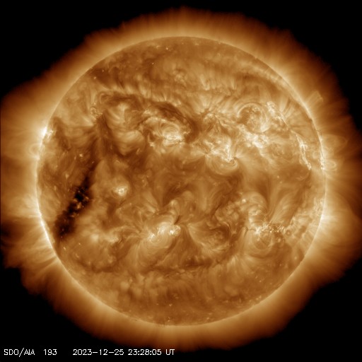 2023/12/26 08:43 更新 太陽風は平均的な状態で、磁気圏は穏やかです。 担当 篠原 太陽風は、速度は400km/秒、磁場強度は5〜6nTと 平均的な状態が続いています。 磁場の南北成分は、 弱い北寄りで推移しています。 このため磁気圏は穏やかで、 AE指数は一時的に小さい変化が発生する程度です。 SDO衛星AIA193の太陽コロナ写真では、 中心部にコロナホールは見られず、 太陽風はしばらく穏やかに推移しそうです。 東端近く(左端)には、縦に伸びるコロナホールが見えていて、 6日後くらいからこの領域の影響で 太陽風の速度が高まる可能性があります。 太陽は、昨日のニュース以降は フレアの発生は少なくなっています。 昨夜、25日21時(世界時25日12時)頃に、 北西の端(右上)でプロミネンス噴出が発生し、 CME(コロナ質量放出)が 太陽の右上に向かって発生しています。 横向きの噴出なので、地球への影響はありません。 ![]() 北西の端で発生したプロミネンス噴出。 (c) GOES衛星SUVI 304 (NOAA)、(動画加工 : 宇宙天気ニュース) ![]() 太陽の右上へ飛び出すCME。 (c) SOHO衛星LASCO C2、C3 (ESA & NASA)、(動画加工 : 宇宙天気ニュース) ![]() SDO衛星のAIA193カメラによる太陽コロナの様子 (c) SDO (NASA) ![]() SDO衛星による太陽の可視光写真。マウスの矢印を写真に重ねると、黒点番号付きの写真に切り替わります。 (c) SDO (NASA) ![]() ACEが観測した太陽風の磁場(1番上の枠、白線は全体の強度、赤線は南北成分) および、太陽風の密度(3番目の橙線)、速度(4番目の黄線) (c) NOAA/SWPC ![]() AE指数(速報値) 下段のAEグラフの値が高くなると、オーロラ活動が活発化しています。 (c) 京都大学WDC ![]() 27日の太陽周期に合わせた図 太陽が同じ面を地球に向けていた27日前の変化から、今後を予想することができます。 (c) 作図:宇宙天気ニュース