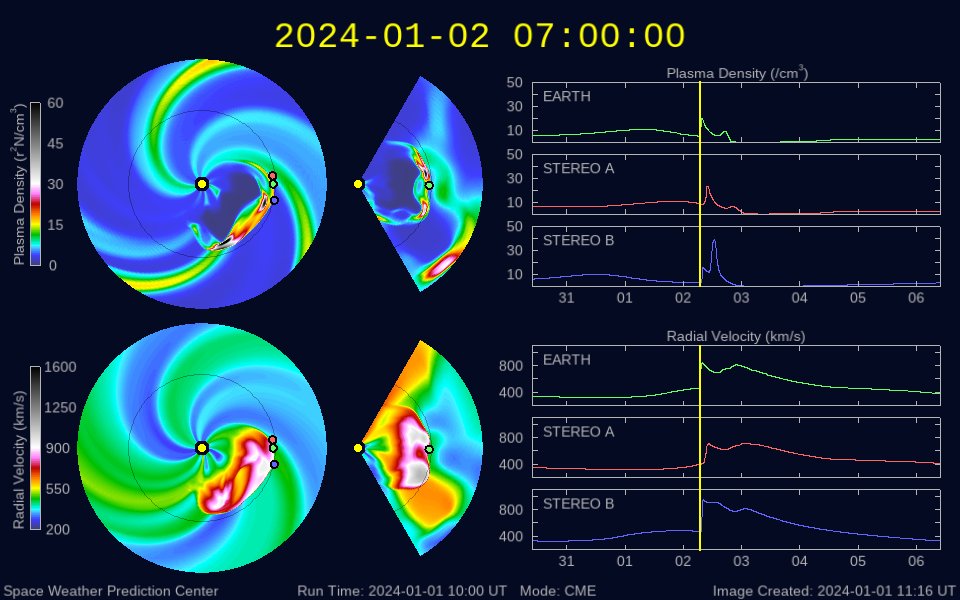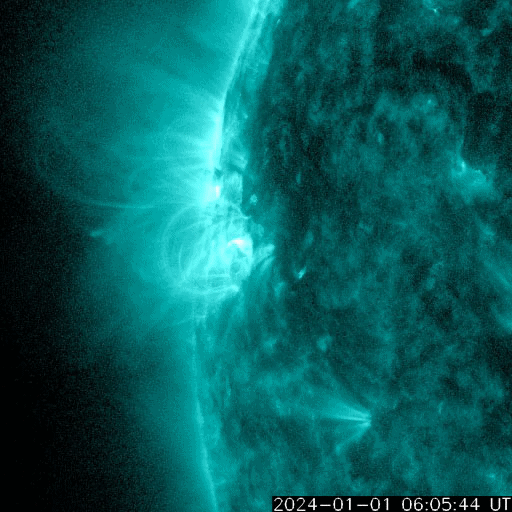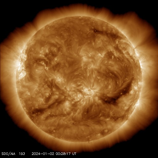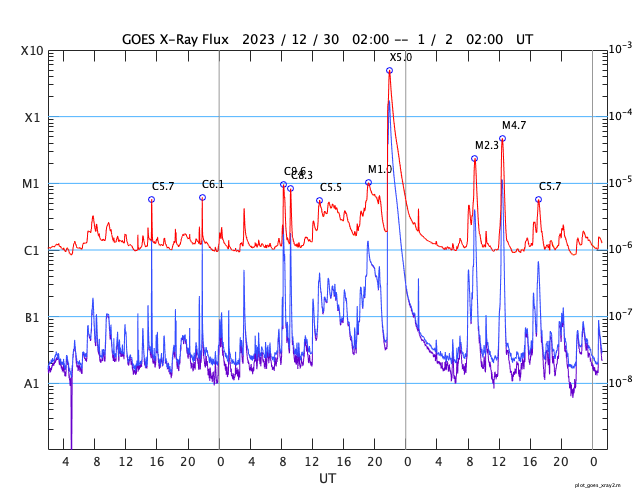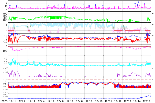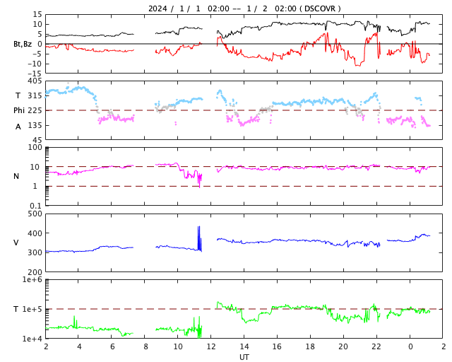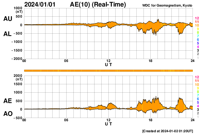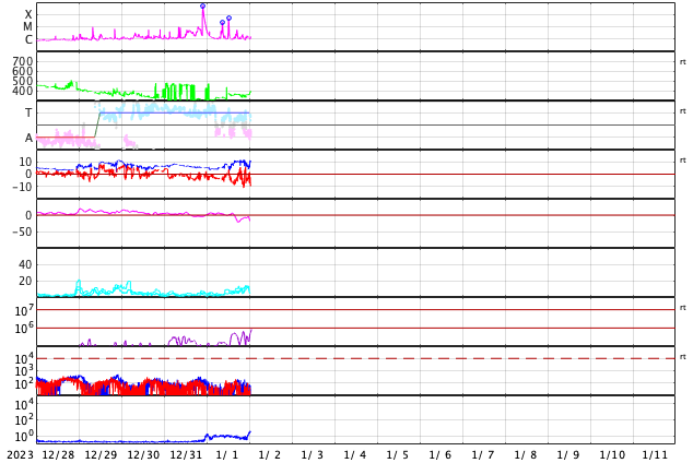 2024/ 1/ 2 10:21 更新 中規模フレアが2回発生しています。今日の午後以降に太陽風の乱れが到来する可能性があります。 担当 篠原 昨日の朝に発生したX5.0の大規模フレアによる太陽風の乱れは、 NOAA/SWPCの予報によると、 今日の夕方、2日16時(世界時2日7時)頃に 地球に到来する可能性があるとのことです。 この場合、フレアの発生から1日半での到来となります。 到来までの時間が短い場合、 太陽風速度の高まりはより大きくなる可能性があります。 今日の午後から明日にかけて、太陽風の変化に注目して下さい。 速度が高まると共に磁場が南向きに強まると、 磁気圏の活動は激しくなります。 オーロラ活動の強まりにも注目して下さい。 X5.0を起こした3536黒点群では、 昨夕、1日17時半(世界時1日8時半)にM2.3、 続いて、1日21時(世界時1日12時)にM4.7と、 中規模フレアが2回発生しています。 SDO衛星AIA131の動画を掲載します。 3536群では、その後も小さい活動が続いています。 また、北東の端(左上)の向こう側にも 活動的な領域がある様です。 引き続き、太陽でのフレアの発生に注目して下さい。 太陽風は、速度が300km/秒から350km/秒へ少し上がり、 グラフの最後では、 400km/秒と平均的な速さに戻っている様です。 磁場強度は、5nTと平均的な状態だったのが、 グラフの途中から 10nT近くに強まって推移する様になっています。 コロナホールの影響が始まったのかもしれません。 太陽風の磁場が強まったため、南北成分の変化も大きくなり、 -5〜 -10nT程度の南向きの変化が見られる様になっています。 このため磁気圏の活動がある程度強まっていて、 AE指数は300〜700nTの小・中規模の変化が続く様になっています。 この後、CMEの乱れもやって来ると思われます。 太陽風はどの様な変化になるでしょうか。