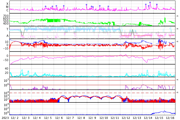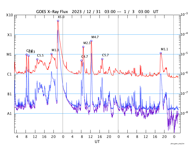 GOES衛星の太陽X線強度。赤・橙 = 0.1〜0.8 nm、青・紫 = 0.05〜0.4 nm (c) データ:NOAA/SWPC、作図:宇宙天気ニュース ![]() | ||||||||||||||||||||||||||||||||||||||||||||||||||||||||||||||||||||||||||||||||||||||||||||||||||||||||||||||||||||||||||||||||||||||||||||||||||||||||||||||||||||||||||||||||||||||||||||||||||||||||||||||||||||||||||||||||||||||||||||||||||||||||||||