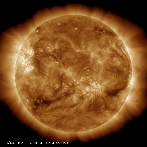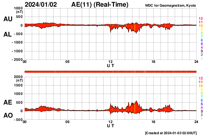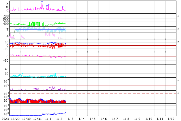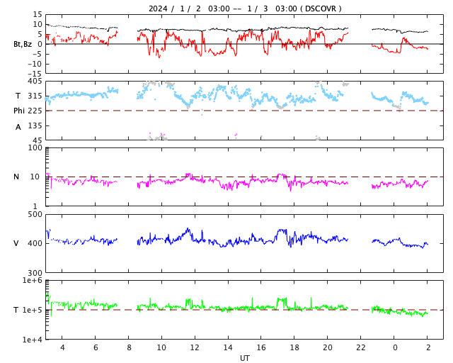 2024/ 1/ 3 11:19 更新 太陽風は平均的な速度で安定しています。乱れの到来はまだです。 担当 篠原 昨日のニュース以降、太陽風の速度は 400km/秒と平均的な状態が続いています。 CME(コロナ質量放出)による太陽風の乱れは 到来していません。 太陽風の磁場強度は、 10nTと強まった状態から次第に低下して、 グラフの最後は6nTと平均的な値に戻っています。 SDO衛星AIA193の太陽コロナ写真では、 注目していたコロナホールは、 西の端近く(右端)まで進んでいます。 この領域の影響は特に見られないままになりそうです。 太陽風磁場の南北成分は、 南北に変化が起きています。 磁気圏ではある程度活動が発生していて、 AE指数は、300〜500nTの小規模の変化が起きたり、 静かになったりしています。 この後、CMEによる太陽風の乱れが到来する可能性があります。 X5.0フレアの発生(1日6時半)から2日と少し過ぎた頃なので、 そろそろやって来るのではないかと思っています。 太陽風の変化、そして磁気圏の乱れに注目して下さい。 太陽は、今日未明、3日3時(世界時2日18時)に、 3536黒点群でM1.1の中規模フレアが発生しています。 目立つ活動はこのくらいです。