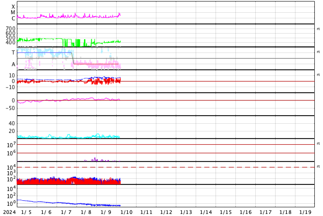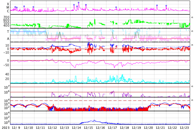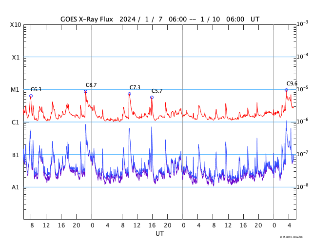 GOES衛星の太陽X線強度。赤・橙 = 0.1〜0.8 nm、青・紫 = 0.05〜0.4 nm (c) データ:NOAA/SWPC、作図:宇宙天気ニュース ![]() | |||||||||||||||||||||||||||||||||||||||||||||||||||||||||||||||||||||||||||||||||||||||||||||||||||||||||||||||||||||||||||||||||||||||||||||||||||||||||||||||||||||||||||||||||||||||||||||||||||||||||||||||||||||||||||||||||||||||||||||||||||||||||||||||||||||||||||||||||||||||||||||||