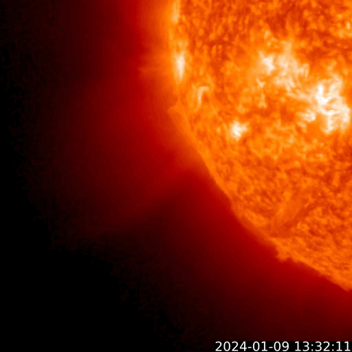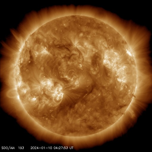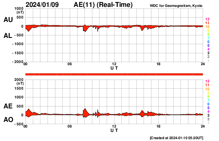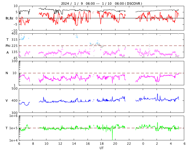 2024/ 1/10 14:30 更新 太陽風は平均的な状態になっています。磁気圏は概ね静穏です。 担当 篠原 太陽風は、昨日の午後から400km/秒と 平均的な速度になっています。 磁場強度も5〜7nTの間で推移していて、 こちらも平均的な状態です。 磁場の南北成分は、南北に変化が見られ、 AE指数は小規模の変化が発生していました。 グラフの後半は穏やかになっています。 SDO衛星AIA193では、コロナホールは特に見られず、 突発的な変化を除くと、 太陽風は穏やかに推移しそうです。 太陽では、10日0時(世界時9日15時)に 南東の端(左下)でプロミネンス噴出が発生しています。 太陽の左下にCME(コロナ質量放出)も飛び出しています。 また、10日6時(世界時9日21時)には 北東の端(左上)でフィラメント噴出が発生しています。 どちらも横向きに発生しているので、 地球への影響はありません。 そして、南東の端の少し向こう側で、 10日12時(世界時10日3時)にC5.4、 北西の端近く(右上)の3538黒点群で 10日12時半(世界時10日3時)半と 10日13時半(世界時10日4時)半に、 C9.6とC7.0の小規模フレアが発生しています。 南東の端は、この後どの様な領域が現れるでしょうか。 ![]() 南東の端で発生したプロミネンス噴出。 (c) GOES衛星SUVI 304 (NOAA)、(動画加工 : 宇宙天気ニュース) ![]() 太陽の左下に飛び出すCME。 (c) SOHO衛星LASCO C2、C3 (ESA & NASA)、(動画加工 : 宇宙天気ニュース) ![]() 北東の端で発生したフィラメント噴出。 (c) GOES衛星SUVI 304 (NOAA)、(動画加工 : 宇宙天気ニュース) ![]() SDO衛星のAIA193カメラによる太陽コロナの様子 (c) SDO (NASA) ![]() SDO衛星による太陽の可視光写真。マウスの矢印を写真に重ねると、黒点番号付きの写真に切り替わります。 (c) SDO (NASA) ![]() DSCOVRが観測した太陽風の磁場(黒線は全体の強度、赤線は南北成分) 磁場の向き、プラズマの密度、速度、温度 (c) データ:NOAA/SWPC、作図:宇宙天気ニュース ![]() AE指数(速報値) 下段のAEグラフの値が高くなると、オーロラ活動が活発化しています。 (c) 京都大学WDC ![]() ![]() 27日の太陽周期に合わせた図 太陽が同じ面を地球に向けていた27日前の変化から、今後を予想することができます。 (c) 作図:宇宙天気ニュース