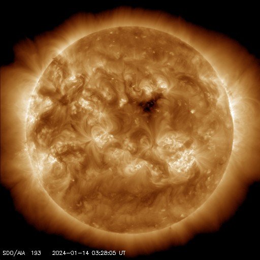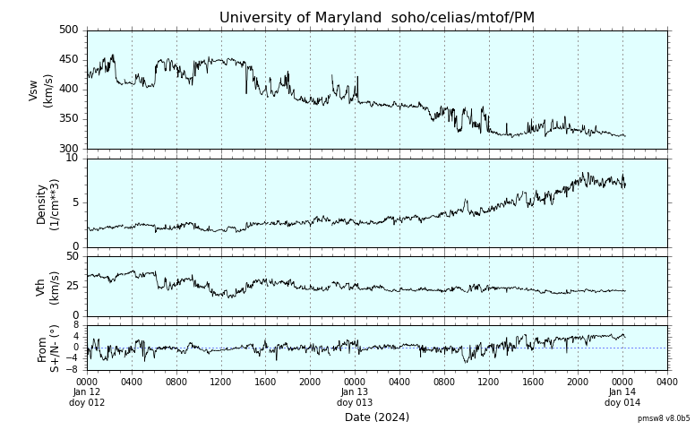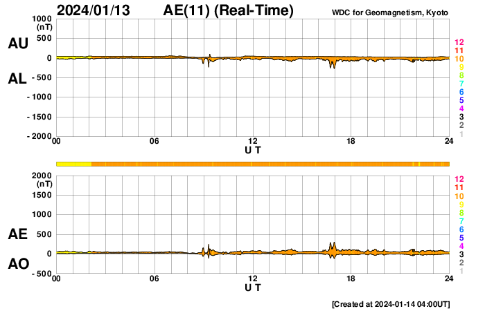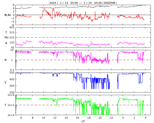 2024/ 1/14 13:17 更新 太陽風は低速になっている様です。太陽は穏やかです。 担当 篠原 DSCOVR衛星の 太陽風速度のグラフが読み取りにくくなっています。 ACE衛星のデータも取得されていないので、 SOHO衛星による観測データを1枚目に掲載します。 これによると、速度は低下の傾向が続いていて、 現在は320km/秒まで下がっている様です。 磁場強度は、DSCOVR衛星によると 4nTから6nTへ少し上がる変化が見えています。 値としては平均的な状態ですが、 この後更に強まるのか、引き続き注目してください。 磁気圏は静穏です。 AE指数は小さい変化が見られる程度です。 太陽は穏やかに推移しています。 X線グラフは変化が少なくなり、 グラフの最後でC4.2の小規模フレアが発生した程度です。 このフレアは、北西の端(右上)に達した 3539黒点群で発生しています。 太陽は、穏やかな状態が続きそうです。 ![]() SOHO衛星による太陽風の2日幅のグラフ。 (c) SOHO/CELIAS Proton Monitor ![]() SDO衛星のAIA193カメラによる太陽コロナの様子 (c) SDO (NASA) ![]() SDO衛星による太陽の可視光写真。マウスの矢印を写真に重ねると、黒点番号付きの写真に切り替わります。 (c) SDO (NASA) ![]() DSCOVRが観測した太陽風の磁場(黒線は全体の強度、赤線は南北成分) 磁場の向き、プラズマの密度、速度、温度 (c) データ:NOAA/SWPC、作図:宇宙天気ニュース ![]() AE指数(速報値) 下段のAEグラフの値が高くなると、オーロラ活動が活発化しています。 (c) 京都大学WDC ![]() ![]() 27日の太陽周期に合わせた図 太陽が同じ面を地球に向けていた27日前の変化から、今後を予想することができます。 (c) 作図:宇宙天気ニュース