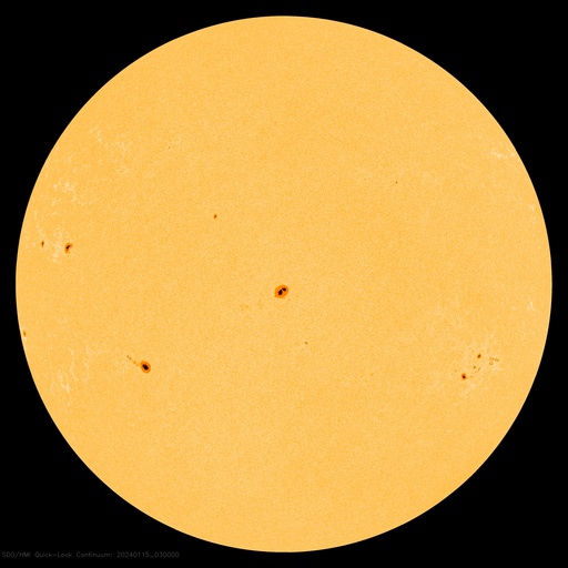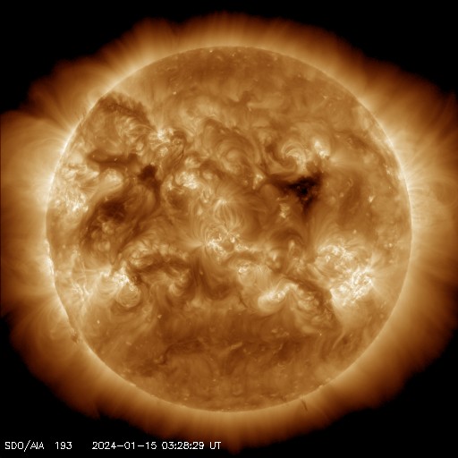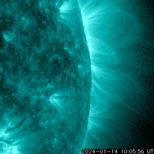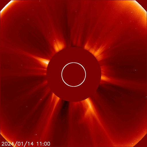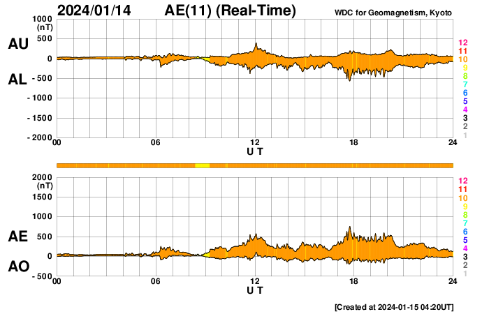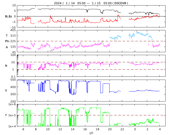 2024/ 1/15 13:28 更新 太陽風は低速の状態が続いています。 担当 篠原 DSCOVR衛星による太陽風速度の観測は、 後半は正しい状態になっている様で、 現在は350km/秒と低速の状態が続いています。 磁場強度は、今朝まで7nTと少し強まっていましたが、 その後下がって、現在は3nTとやや弱くなっています。 磁場の南北成分は、 昨日のニュース以降南向きが続く様になり、 -5nT付近の状態が今朝まで続きました。 このため、磁気圏はやや活動的な状態が続き、 AE指数は300〜500nTの小規模の変化が 半日ほど連続して発生しています。 今朝以降、磁場の南向きの変化は小さくなり、 グラフの最後は0nT付近になっています。 これに合わせて磁気圏の活動も弱くなり、 AE指数は変化が見られなくなっています。 SDO衛星AIA193の太陽コロナ写真では、 北西側(右上)に小さいコロナホールが見えています。 この後、弱い影響がやって来るでしょうか。 太陽は、昨夜、14日20時半(世界時14日11時半)に、 西の端(右端)の少し向こう側で C9.6の小規模フレアが発生しました。 SDO衛星AIA131の動画を掲載します。 フレアの全体が見えていないので、 実際の規模はこれよりも大きかった可能性があります。 このフレアに伴って、 CME(コロナ質量放出)が太陽の右側に飛び出しています。 横向きなので影響はありません。 太陽のこちら側では、 14日22時(世界時14日13時)に南東(左下)の3549群でC7.2、 15日2時(世界時14日17時)に南西(右下)の3541群でC5.8 などの小規模フレアが発生しています。 現在のX線グラフの変化は少なく、 太陽は比較的穏やかな状態です。 ![]() 西の端の少し向こう側で発生したC9.6の小規模フレア。 (c) SDO衛星AIA131 (NASA)、(動画加工 : 宇宙天気ニュース) ![]() 太陽の右へ飛び出すCME。 (c) SOHO衛星LASCO C2、C3 (ESA & NASA)、(動画加工 : 宇宙天気ニュース) ![]() SDO衛星のAIA193カメラによる太陽コロナの様子 (c) SDO (NASA) ![]() SDO衛星による太陽の可視光写真。マウスの矢印を写真に重ねると、黒点番号付きの写真に切り替わります。 (c) SDO (NASA) ![]() DSCOVRが観測した太陽風の磁場(黒線は全体の強度、赤線は南北成分) 磁場の向き、プラズマの密度、速度、温度 (c) データ:NOAA/SWPC、作図:宇宙天気ニュース ![]() AE指数(速報値) 下段のAEグラフの値が高くなると、オーロラ活動が活発化しています。 (c) 京都大学WDC ![]() ![]() 27日の太陽周期に合わせた図 太陽が同じ面を地球に向けていた27日前の変化から、今後を予想することができます。 (c) 作図:宇宙天気ニュース