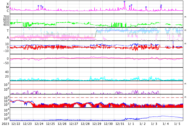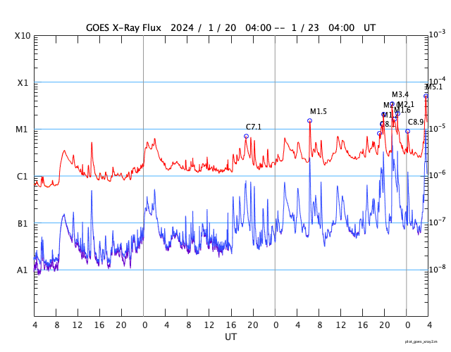 GOES衛星の太陽X線強度。赤・橙 = 0.1〜0.8 nm、青・紫 = 0.05〜0.4 nm (c) データ:NOAA/SWPC、作図:宇宙天気ニュース ![]() | ||||||||||||||||||||||||||||||||||||||||||||||||||||||||||||||||||||||||||||||||||||||||||||||||||||||||||||||||||||||||||||||||||||||||||||||||||||||||||||||||||||||||||||||||||||||||||||||||||||||||||||||||||||||||||||||||||||||||||||||||||||||||||||||||||||||||||||||||||||||||||||||||||||||||||||||||||||||