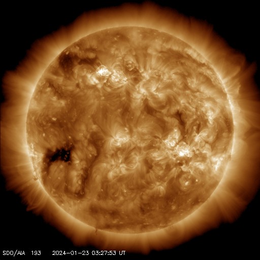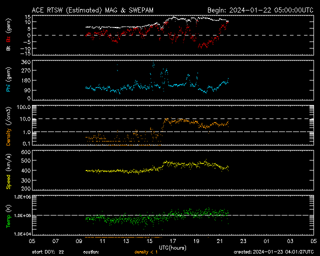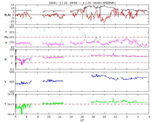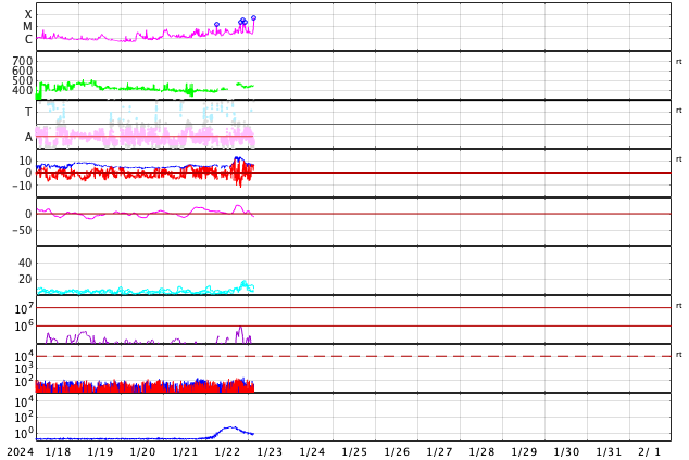 2024/ 1/23 13:02 更新 太陽風の乱れは小規模でした。Mクラスのフレアが次々に発生しています。 担当 篠原 20日の夕方に発生したCME(コロナ質量放出) による太陽風の乱れは、 今日未明、23日1時(世界時22日16時)頃に ACE衛星に達した様で、 速度は400km/秒から470km/秒へ、 磁場強度は7nTから14nTへ、それぞれ高まっています。 変化としては小規模で、 上がり方もなだらかで変化がはっきりしません。 密度のグラフだけは、 1個未満から10個程度へ急に増加しています。 現在は、速度は450km/秒、磁場強度は7nTと、 平均的な状態に戻りかけています。 磁場の南北成分は、一時的に南向きに強まった程度で、 AE指数は1000nTと、 この時間帯だけ磁気圏の活動が強まりました。 太陽は、昨日のニュース以降、様々な活動が続いています。 昨日注目していた3559黒点群は、 22日15時(世界時22日6時)にM1.5、 23日4時半(世界時22日19時半)にM1.2と、 中規模フレアを2回起こしました。 この頃から南西(右下)の3561群の活動が強まり、 23日4時半(世界時22日19時半)にM2.0、 23日6時(世界時22日21時)にM3.4、 23日6時半(世界時22日21時半)にM1.6、 23日7時半(世界時22日22時半)にM2.1と、 中規模フレアが次々に発生しています。 SDO衛星AIA131の動画を掲載します。 −−以下の文は、14時に加筆しました−− X線グラフの最後、23日12時(世界時23日3時)に M5.1の中規模フレアが発生しています。 最初の記事では3561群で発生したと書いていましたが、 正しくは、3559群で起きています。 記事を書いたときは発生直後で、 SDO衛星の画像が揃っていなかったため、 ほぼ同時に発生した別のフレアの輝きを誤認したためです。 −−加筆ここまで−− 引き続き、3561群や3559群の活動に注目してください。 また、フィラメント噴出やプロミネンス噴出が、 22日18時(世界時22日9時)に南側で、 22日21時(世界時22日12時)に北側で、 23日2時(世界時22日17時)に西の端で発生しました。 SDO衛星AIA304の動画を掲載します。 これらの噴出により、 CME(コロナ質量放出)も次々に飛び出しています。 横向きに飛び出している印象で、 地球への影響はないか、到来しても弱い変化になりそうです。