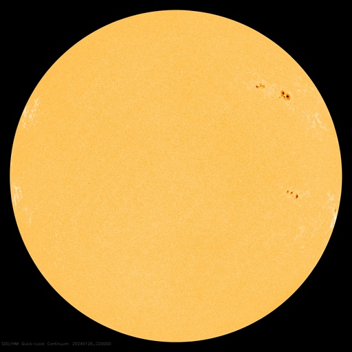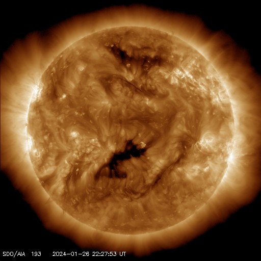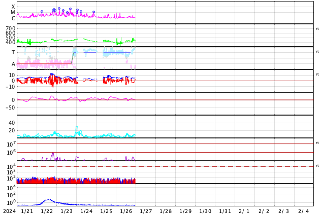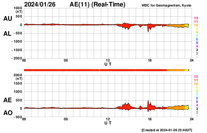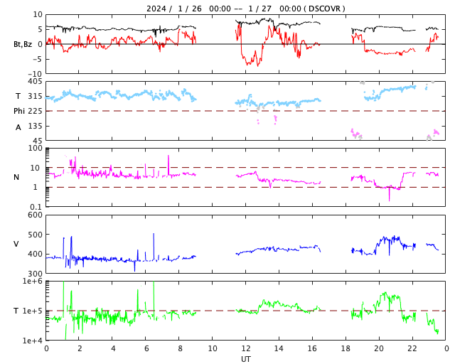 2024/ 1/27 08:43 更新 太陽風は平均的な状態です。太陽は穏やかに推移しています。 担当 篠原 太陽風の速度は、400km/秒から450km/秒へ少し上がっています。 磁場強度は、5〜6nT程度で推移しています。 どちらも平均的な状態です。 磁場の南北成分は、南向きに変化する時間帯があり、 AE指数では200〜500nTの小規模の変化が起きています。 太陽風のグラフの最後は南向きになっていて、 この傾向が続くと、磁気圏もやや活動的な状態が続くでしょう。 SDO衛星AIA193では、 コロナホールが太陽の中心線上に見えています。 2〜3日後くらいに 太陽風速度の高まりがやって来る可能性があります。 太陽は、昨日の昼に発生したC9.0の小規模フレア以降は、 目立った活動は起きていません。 活発にフレアを起こしていた南西の端(右下)の3561黒点群は、 太陽の向こう側に進もうとしています。 一方、東端(左端)の新しい領域は特に活動的な様子はなく、 このまま、太陽は穏やかな状態になりそうです。