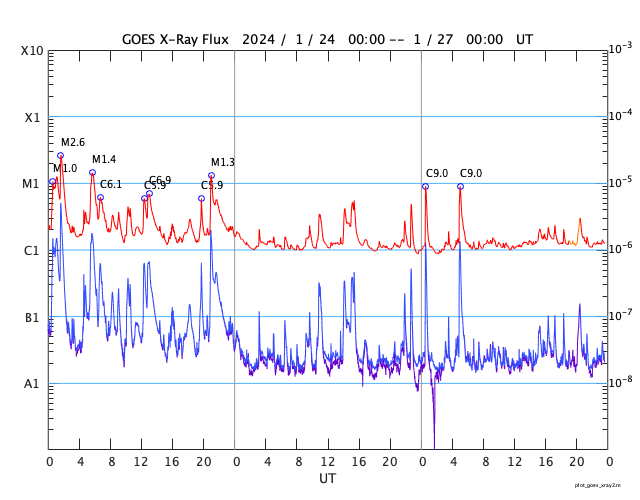 GOES衛星の太陽X線強度。赤・橙 = 0.1〜0.8 nm、青・紫 = 0.05〜0.4 nm (c) データ:NOAA/SWPC、作図:宇宙天気ニュース ![]() | |||||||||||||||||||||||||||||||||||||||||||||||||||||||||||||||||||||||||||||||||||||||||||||||||||||||||||||||||||||||||||||||||||||||||||||||||||||||||||||||||||||||||||||||||||||||||||||||||||||||||||||||||||||||||||||||||||||||||||||||||||||||||||