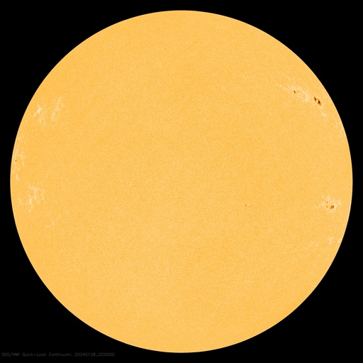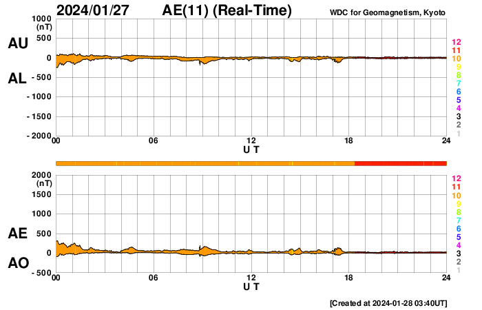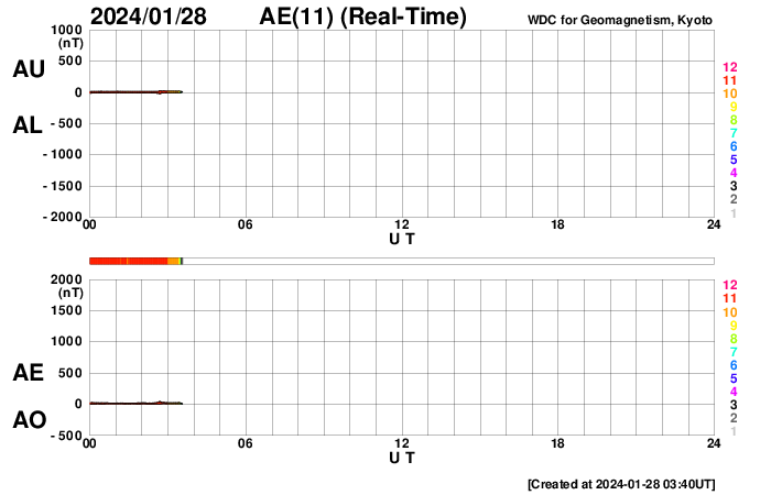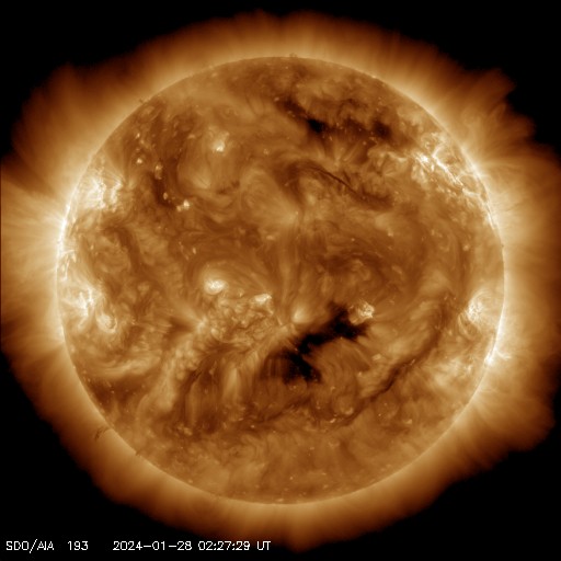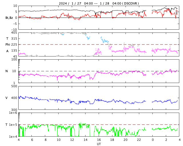 2024/ 1/28 12:51 更新 太陽風はやや低速で、磁気圏も穏やかです。 担当 篠原 太陽風の速度は、昨夜に400km/秒台を割り、 370km/秒とやや低速になっています。 磁場強度は、6〜7nTで推移していましたが、 グラフの最後で9nTへ少し強まっています。 SDO衛星AIA193の太陽コロナ写真では、 コロナホールが西側へ進んでいます。 影響は1〜2日後くらいからになりそうです。 その一方、太陽風のグラフでは 最後に磁場が少し強まっています。 この変化が続いて、速度の高まりも始まるかもしれません。 しばらく注目してください。 現在の磁気圏は静穏です。 AE指数はほとんど変化がありません。 太陽は穏やかで、 C2台の小さい小規模フレアが発生した程度です。 可視光写真では黒点が少なくなっていて、 西側の3559群、3560群が沈んだ後は、 かなり寂しくなるかもしれません。