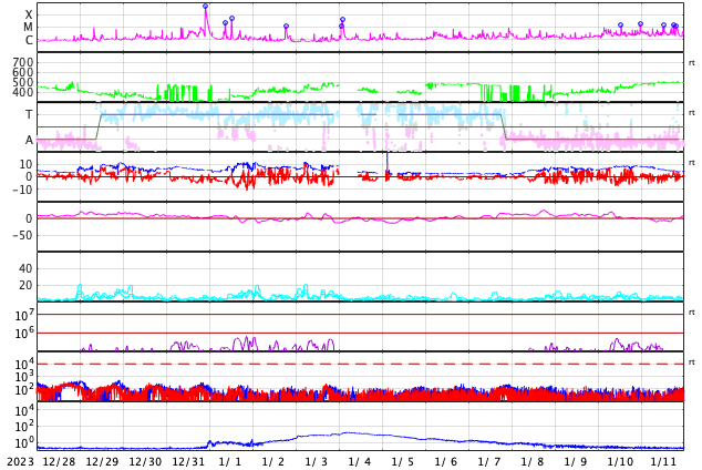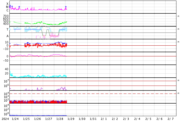 GOES衛星の太陽X線強度。赤・橙 = 0.1〜0.8 nm、青・紫 = 0.05〜0.4 nm (c) データ:NOAA/SWPC、作図:宇宙天気ニュース ![]() | |||||||||||||||||||||||||||||||||||||||||||||||||||||||||||||||||||||||||||||||||||||||||||||||||||||||||||||||||||||||||||||||||||||||||||||||||||||||||||||||||||||||||||||||||||||||||||||||||||||||||||||||||||||||||||||||||||||||||||||||