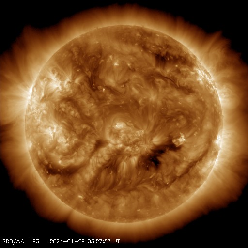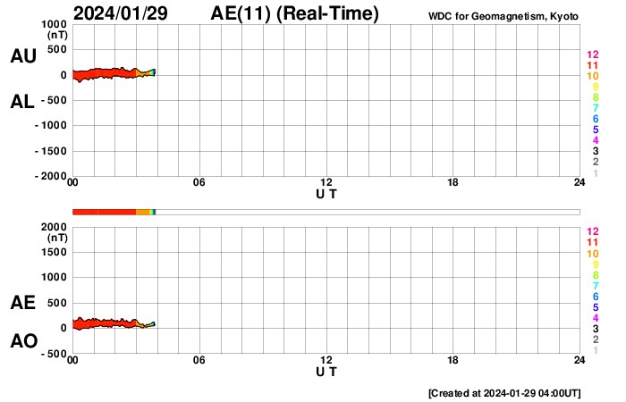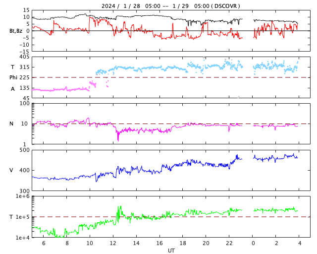 2024/ 1/29 13:15 更新 太陽風は平均的な状態です。M1.2の中規模フレアが発生しました。 担当 篠原 太陽風の速度は、 昨日の午後に360km/秒まで下がった後、 ゆっくりと上昇して、 現在は460km/秒と平均的な状態です。 磁場強度は、今日未明にかけて 10nT前後に強まった状態が続きましたが、 その後は下がり、現在は6nTと平均的な値に戻っています。 磁場の南北成分は、グラフの中盤で南寄りになっています。 このため、AE指数では400nT程度の 小規模の変化が発生しました。 現在の太陽風は、磁場はやや北寄りになっています。 この傾向が続くと、磁気圏の活動は穏やかになるでしょう。 SDO衛星AIA193では、コロナホールが西側に進んでいます。 この後、太陽風の速度はもう一段高まるでしょうか。 太陽では、北西の端(右上)に近付いた3559黒点群で、 29日10時半(世界時29日1時半)に M1.2の中規模フレアが発生しました。 3559群はこの後西の端に沈んで行きます。 一方、北東の端(左上)で、 C3.4、C5.2の小規模フレアが発生しています。 可視光写真では、黒点が現れています。 どの様な領域でしょうか。 ![]() SDO衛星のAIA193カメラによる太陽コロナの様子 (c) SDO (NASA) ![]() SDO衛星による太陽の可視光写真。マウスの矢印を写真に重ねると、黒点番号付きの写真に切り替わります。 (c) SDO (NASA) ![]() DSCOVRが観測した太陽風の磁場(黒線は全体の強度、赤線は南北成分) 磁場の向き、プラズマの密度、速度、温度 (c) データ:NOAA/SWPC、作図:宇宙天気ニュース ![]() AE指数(速報値) 下段のAEグラフの値が高くなると、オーロラ活動が活発化しています。 (c) 京都大学WDC ![]() ![]() 27日の太陽周期に合わせた図 太陽が同じ面を地球に向けていた27日前の変化から、今後を予想することができます。 (c) 作図:宇宙天気ニュース