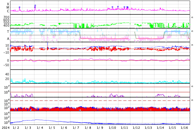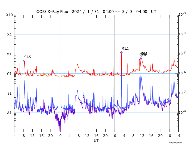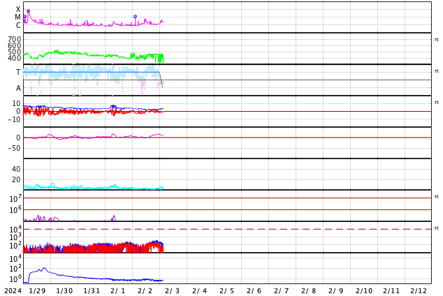 GOES衛星の太陽X線強度。赤・橙 = 0.1〜0.8 nm、青・紫 = 0.05〜0.4 nm (c) データ:NOAA/SWPC、作図:宇宙天気ニュース ![]() | ||||||||||||||||||||||||||||||||||||||||||||||||||||||||||||||||||||||||||||||||||||||||||||||||||||||||||||||||||||||||||||||||||||||||||||||||||||||||||||||||||||||||||||||||||||||||||||||||||||||||||||||||||||||||||||||||||||||||||||||||||||||||||||||||||||