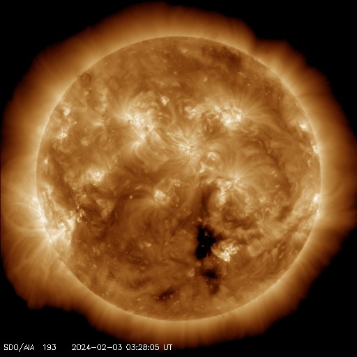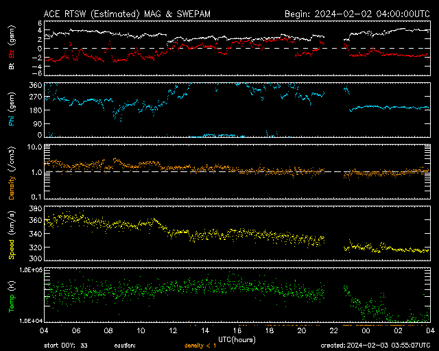 2024/ 2/ 3 12:56 更新 太陽風は低速で、磁気圏も穏やかです。 担当 篠原 太陽風の速度は360km/秒から320km/秒へ下がり、 より低速になっています。 磁場強度も、2〜4nTとやや弱い状態です。 磁気圏は穏やかで、 AE指数は変化が見られなくなっています。 SDO衛星AIA193では、 南半球のコロナホールが西側に進んでいます。 明日くらいから 太陽風速度の高まりが見られるかもしれません。 太陽では、南東側(左下)の3571黒点群で、 小規模の活動が続いていて、 C3.2、C5.6、C3.0、C3.1などのフレアが発生しています。 引き続き注目してください。 また、南東の端の少し向こう側にも活動的な領域がある様で、 昨夜以降に、C6.5、C4.7に達する変化が観測されています。 フレアが起きている領域は見えていないので、 実際の規模はこれよりも大きかった可能性があります。 この後、どの様な領域が現れるでしょうか。 ![]() SDO衛星のAIA193カメラによる太陽コロナの様子 (c) SDO (NASA) ![]() SDO衛星による太陽の可視光写真。マウスの矢印を写真に重ねると、黒点番号付きの写真に切り替わります。 (c) SDO (NASA) ![]() ACEが観測した太陽風の磁場(1番上の枠、白線は全体の強度、赤線は南北成分) および、太陽風の密度(3番目の橙線)、速度(4番目の黄線) (c) NOAA/SWPC ![]() AE指数(速報値) 下段のAEグラフの値が高くなると、オーロラ活動が活発化しています。 (c) 京都大学WDC ![]() ![]() 27日の太陽周期に合わせた図 太陽が同じ面を地球に向けていた27日前の変化から、今後を予想することができます。 (c) 作図:宇宙天気ニュース