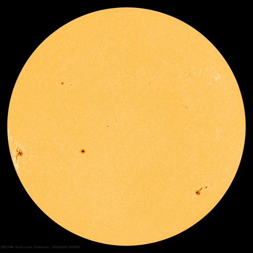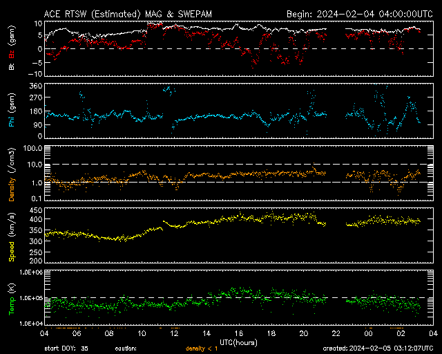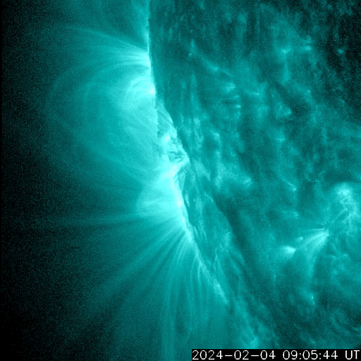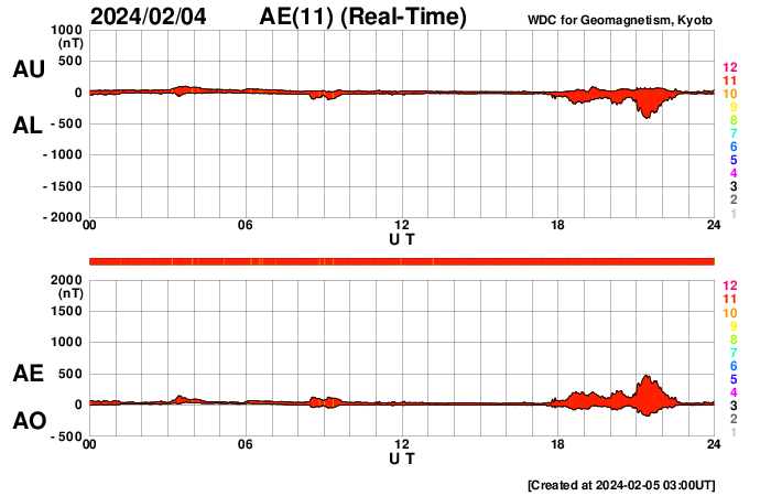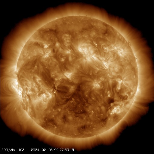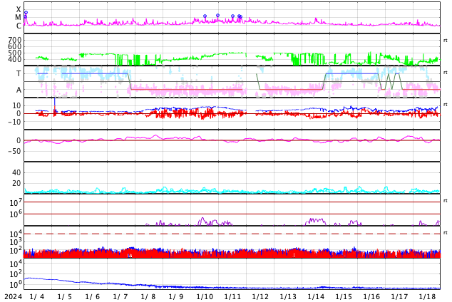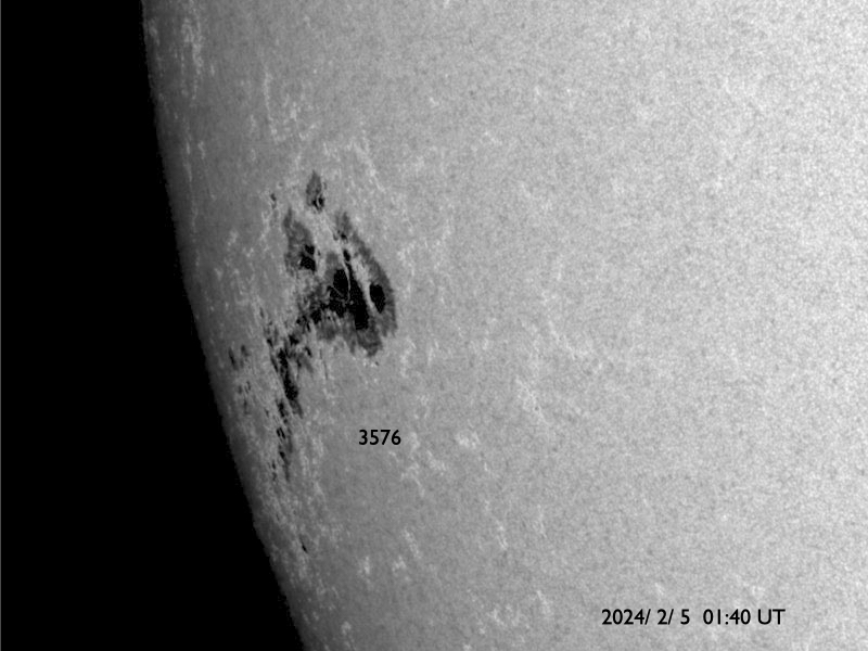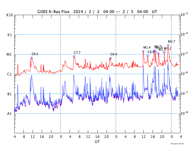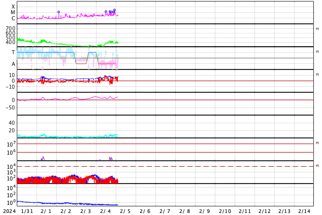 2024/ 2/ 5 12:11 更新 Mクラスのフレアが連続しています。太陽風は平均的な速度になっています。 担当 篠原 昨夜から、太陽の南東の端近く(左下)の3576黒点群の活動が強まり、 今朝にかけて、M1.4、M1.5、M1.3、M1.2、M2.1、M2.7と、 中規模フレアが6回発生しています。 活動の様子を、SDO衛星AIA131の動画で紹介します。 途中にCクラスのフレアがいくつも発生しているので、 にぎやかな変化になっています。 可視光写真では、大きい黒点が見えています。 引き続きこの領域の活動に注目してください。 太陽風は、速度が400km/秒に上がり、 平均的な速さになっています。 磁場強度は、7nT前後と少し強くなっています。 磁場の南北成分は、北寄りになっています。 一時的に南向きに変化する時間帯があり、 その頃にAE指数で500nTの中規模の変化が発生していますが、 その他は変化が無く、磁気圏は穏やかな状態です。