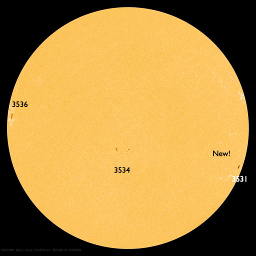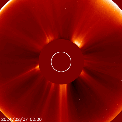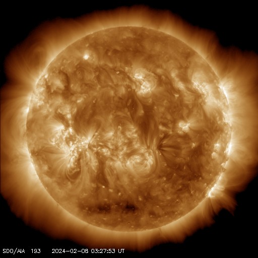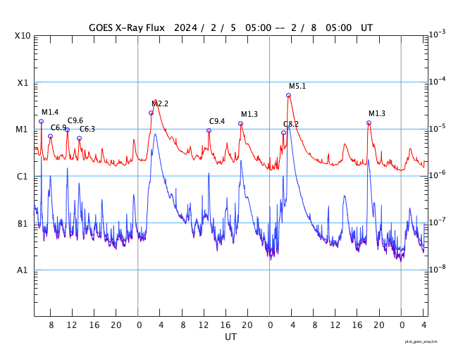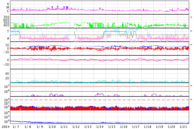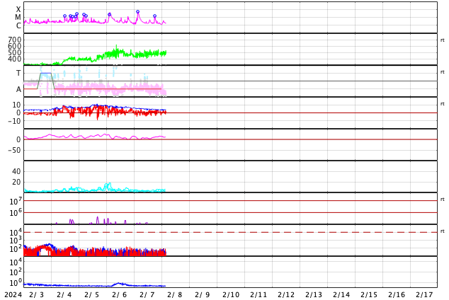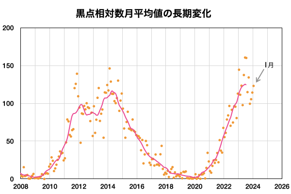 2024/ 2/ 8 13:26 更新 太陽ではフレアが続いています。1月の黒点相対数は 123.0 でした。 担当 篠原 1月の黒点相対数は 123.0 とWDC-SILSOから発表されました。 昨年10月には、99.4と一旦100を割りましたが、 その後は、11月は105.4、12月は114.2と次第に高まって、 グラフを見ると、13か月平均値の赤線)の 今期のピークと同じ高さに戻っています。 前の周期である第24期の推移を参考にすると、 黒点数の高まりは、これから2年くらい続きそうです。 どの様な活動が見られるでしょうか。 気長に注目を続けて下さい。 昨日のニュース更新の頃、 7日12時(世界時7日3時)に南西(右下)の3575黒点群で発生した M5.1の中規模フレアについて、少し長い動画を掲載します。 CME(コロナ質量放出)は、 太陽の右下へやや淡い噴出が発生しています。 横向きに近いので地球への影響はないでしょう。 その後の太陽は、南東(左下)の3576群で、 M1.3の中規模フレア、 C4.9の小規模フレアなどが発生しています。 この領域では、小さい活動が頻繁に発生しています。 活動の強まりが見られるでしょうか。 太陽風は、速度が430km/秒から480km/秒へ少し高まり、 やや高速の状態になっています。 磁場強度は、6nTから4nTへ少し下がっていますが、 平均的な状態で推移しています。 磁気圏は概ね静穏で、 AE指数は300nTの小規模の変化が1回発生した程度で、 その前後は変化のない状態が続いています。 ![]() 太陽黒点相対数の長期変化。1月の黒点相対数は 123.0 でした。 (c) 黒点データ:WDC-SILSO、作図:宇宙天気ニュース ![]() 1月の太陽黒点の推移。SDO衛星。 (c) SDO衛星 (NASA)、(動画加工 : 宇宙天気ニュース) ![]() 1975年以降の太陽黒点相対数の長期変化。 (c) 黒点データ:WDC-SILSO、作図:宇宙天気ニュース ![]() 7日に3575黒点群で発生したM5.1の中規模フレア。 (c) SDO衛星AIA131 (NASA)、(動画加工 : 宇宙天気ニュース) (c) SOHO衛星LASCO C2、C3 (ESA & NASA)、(動画加工 : 宇宙天気ニュース) ![]() SDO衛星のAIA193カメラによる太陽コロナの様子 (c) SDO (NASA) ![]() SDO衛星による太陽の可視光写真。マウスの矢印を写真に重ねると、黒点番号付きの写真に切り替わります。 (c) SDO (NASA) ![]() GOES衛星の太陽X線強度。赤・橙 = 0.1〜0.8 nm、青・紫 = 0.05〜0.4 nm (c) データ:NOAA/SWPC、作図:宇宙天気ニュース ![]() ACEが観測した太陽風の磁場(1番上の枠、白線は全体の強度、赤線は南北成分) および、太陽風の密度(3番目の橙線)、速度(4番目の黄線) (c) NOAA/SWPC ![]() AE指数(速報値) 下段のAEグラフの値が高くなると、オーロラ活動が活発化しています。 (c) 京都大学WDC ![]() ![]() 27日の太陽周期に合わせた図 太陽が同じ面を地球に向けていた27日前の変化から、今後を予想することができます。 (c) 作図:宇宙天気ニュース
