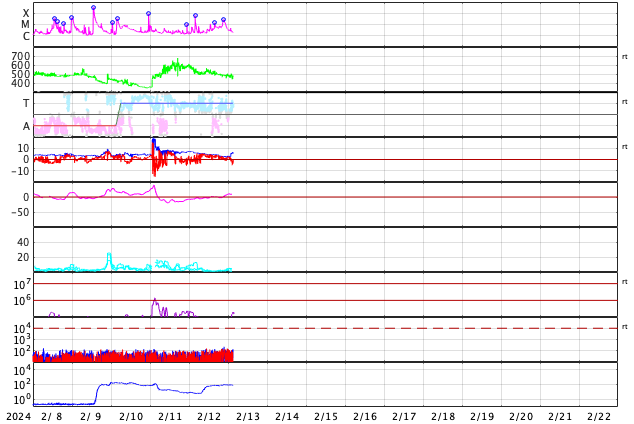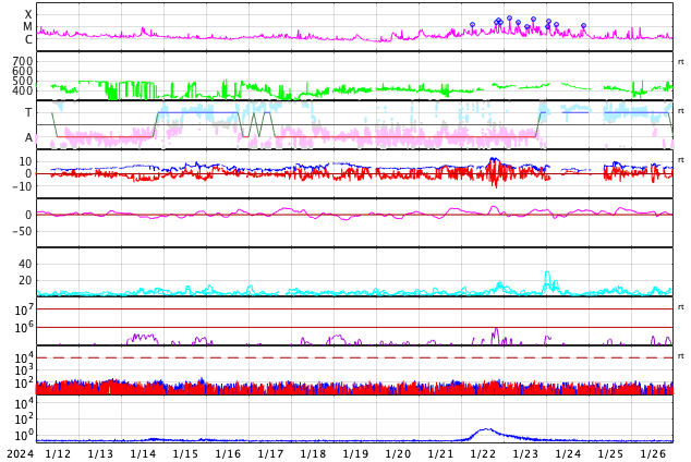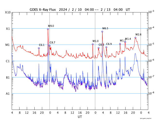 GOES衛星の太陽X線強度。赤・橙 = 0.1〜0.8 nm、青・紫 = 0.05〜0.4 nm (c) データ:NOAA/SWPC、作図:宇宙天気ニュース ![]() | ||||||||||||||||||||||||||||||||||||||||||||||||||||||||||||||||||||||||||||||||||||||||||||||||||||||||||||||||||||||||||||||||||||||||||||||||||||||||||||||||||||||||||||||||||||||||||||||||||||||||||||||||||||||||||||||||||||||||||||||||||||||||||||||||||||||||||||||||||||||||||||||