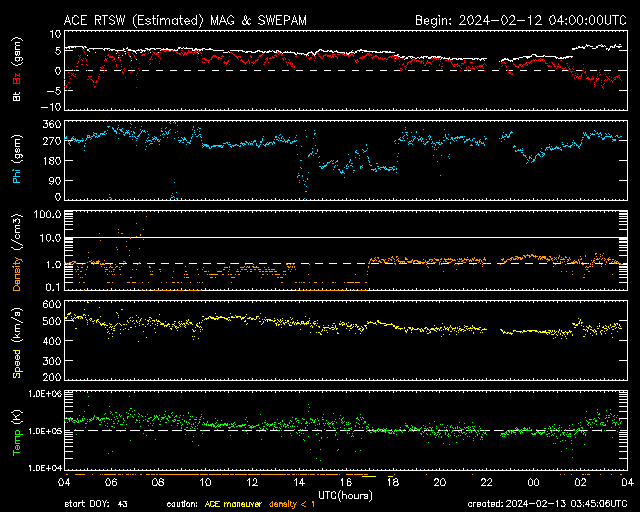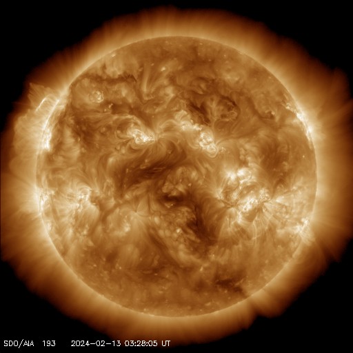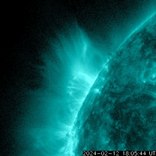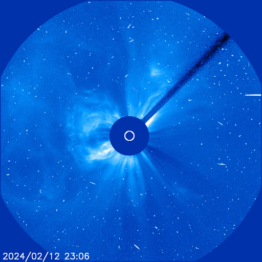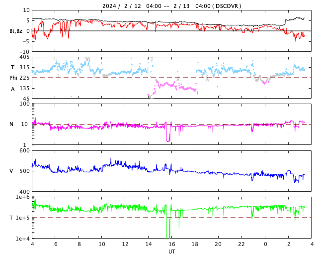 2024/ 2/13 12:46 更新 太陽風の小さい変化が到来しました。太陽でCMEの発生が続いています。 担当 篠原 13日10時40分(世界時13日1時40分)頃に、 DSCOVR衛星で 太陽風磁場の急な強まりが観測されました。 変化はl小幅で、3nTから6nTへ強まった程度です。 太陽風速度の変化はほとんどなく、 DSCOVR衛星のグラフでは、 480km/秒から450km/秒へ下がり、 ACE衛星は、その前から450km/秒の状態が続いています。 変化が小さいことから、昨日注目していた M9.0フレアに関係する太陽風の乱れではない様です。 引き続き太陽風の変化に注目してください。 太陽風磁場の南北成分は、北寄りの傾向が続いていました。 このため磁気圏は穏やかで、 AE指数はほとんど変化のない状態です。 グラフの最後、磁場の強まりが来た後は 磁場が南寄りになっています。 この傾向が続くと、 磁気圏で小規模の変化が見られる様になるかもしれません。 太陽は、あちこちで現象が発生しています。 昨日の午後、12日15時半(世界時12日6時半)に、 SOHO衛星LASCO C2で太陽の右下に飛び出す CME(コロナ質量放出)が観測されました。 太陽のこちら側では特に変化が起きていないので、 向こう側で発生した現象の様です。 動画を見ると、CMEは結構速く広がっています。 比較的規模の大きいフレアが発生したのかもしれません。 昨夜、12日22時(世界時12日13時)には、 太陽の北東の端(左上)でプロミネンス噴出が発生しました。 GOES衛星SUVI 304の動画を掲載します。 なかなか大きい噴出で、 CMEも太陽の左に向かって飛び出しています。 SOHO衛星LASCO C2、C3の動画を掲載しますが、 後半の画像がないため、途中で止まっています。 そして、今朝、13日5時半(世界時12日20時半)に、 太陽の北東の端の少し向こう側で M2.6の中規模フレアが発生しました。 SDO衛星AIA131の動画を掲載します。 このフレアに伴って、CMEが太陽の左へ飛び出しています。 SOHO衛星の画像が欠けているため、 途中から広がる様子を紹介します。 今日紹介した3つのCMEは、 どれも地球への影響はなさそうですが、 頻繁に噴出が起きているので、 この後も太陽の活動に注目してください。 ![]() 太陽の右下に飛び出すCME。向こう側の現象の様です。 (c) SOHO衛星LASCO C2、C3 (ESA & NASA)、(動画加工 : 宇宙天気ニュース) ![]() 北東の端で発生したプロミネンス噴出。 (c) GOES衛星SUVI 304 (NOAA)、(動画加工 : 宇宙天気ニュース) ![]() 太陽の左側へ飛び出すCME。 (c) SOHO衛星LASCO C2、C3 (ESA & NASA)、(動画加工 : 宇宙天気ニュース) ![]() 北東の端で発生したM2.6の中規模フレア。 (c) SDO衛星AIA131 (NASA)、(動画加工 : 宇宙天気ニュース) ![]() 途中からですが、太陽の左側へCMEが広がっています。 (c) SOHO衛星LASCO C3 (ESA & NASA)、(動画加工 : 宇宙天気ニュース) ![]() SDO衛星のAIA193カメラによる太陽コロナの様子 (c) SDO (NASA) ![]() SDO衛星による太陽の可視光写真。マウスの矢印を写真に重ねると、黒点番号付きの写真に切り替わります。 (c) SDO (NASA) ![]() DSCOVRが観測した太陽風の磁場(黒線は全体の強度、赤線は南北成分) 磁場の向き、プラズマの密度、速度、温度 (c) データ:NOAA/SWPC、作図:宇宙天気ニュース ![]() ACEが観測した太陽風の磁場(1番上の枠、白線は全体の強度、赤線は南北成分) および、太陽風の密度(3番目の橙線)、速度(4番目の黄線) (c) NOAA/SWPC ![]() AE指数(速報値) 下段のAEグラフの値が高くなると、オーロラ活動が活発化しています。 (c) 京都大学WDC ![]() ![]() 27日の太陽周期に合わせた図 太陽が同じ面を地球に向けていた27日前の変化から、今後を予想することができます。 (c) 作図:宇宙天気ニュース